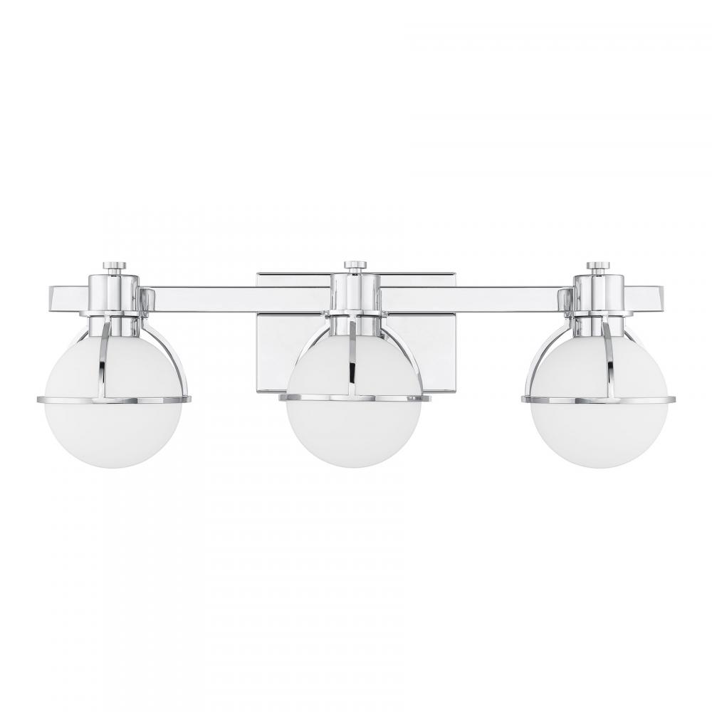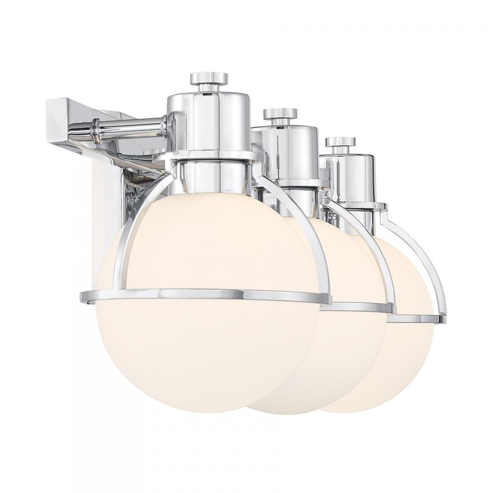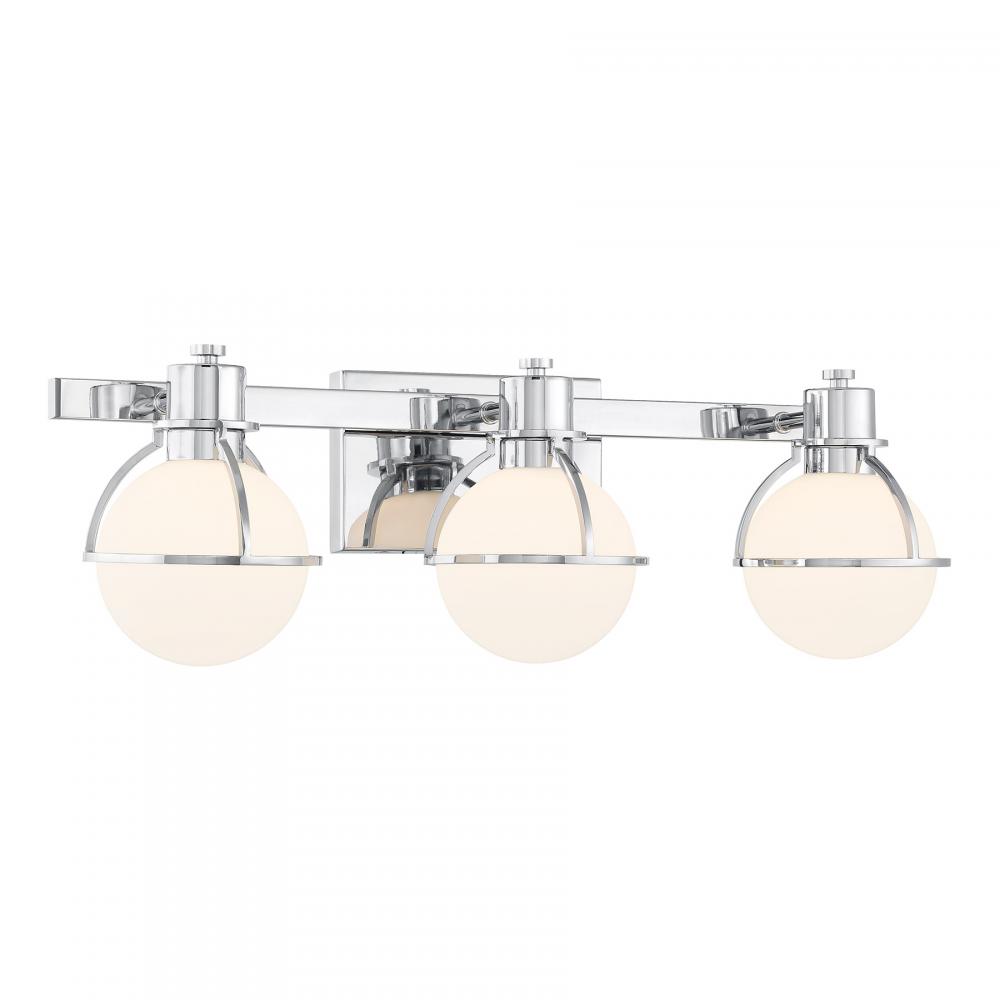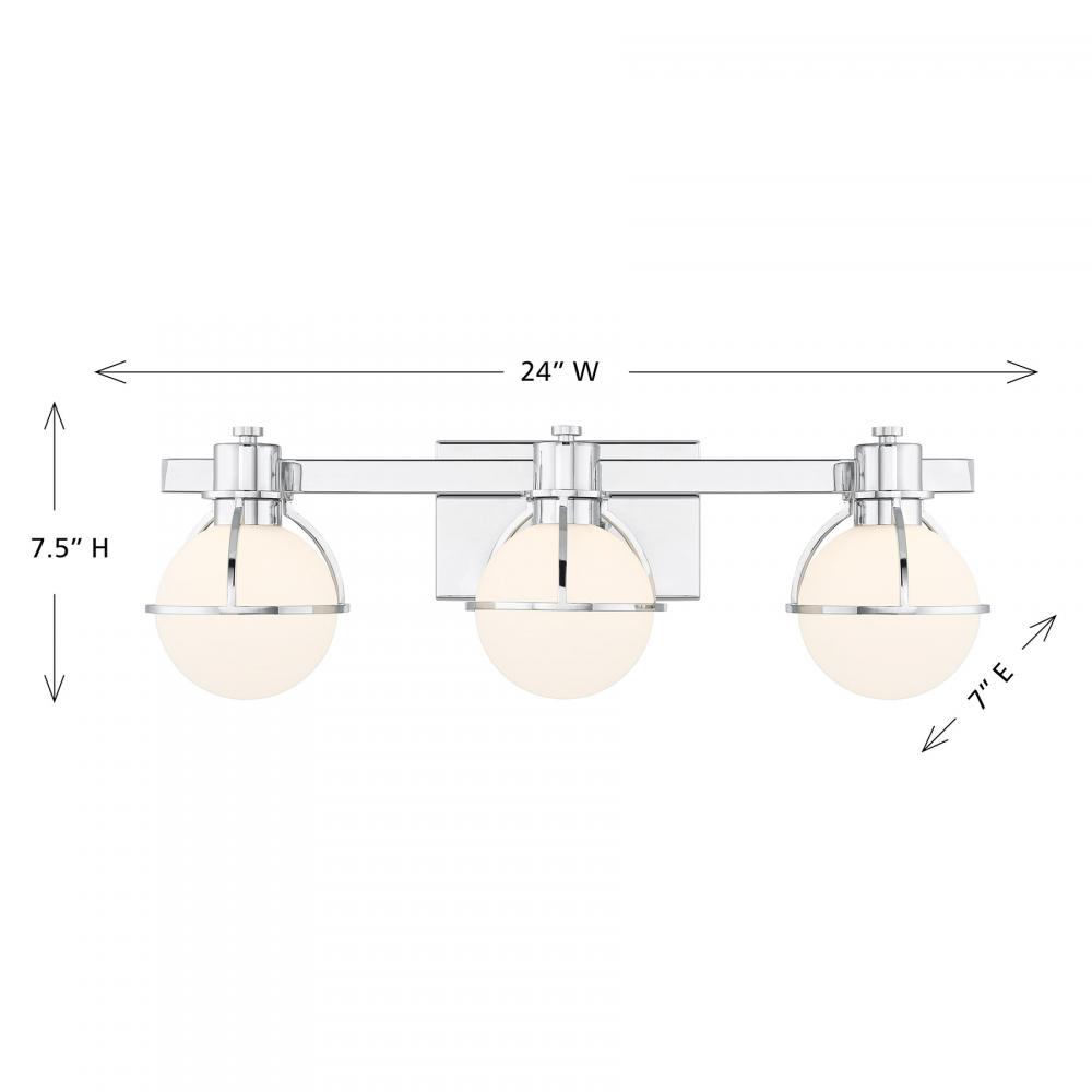 The Savoy House Pierce 3-light bath light offers up a retro, factory-inspired style that makes it an excellent choice for stylish bathroom lighting. Slender, curving half-cages finished in Chrome securely hold orbs of white opal glass that will provide a bright and welcoming glow. Pierce is 7.5" in height, 24" in width and extends 7" from the wall. Uses three G9 style bulbs of up to 60 watts per bulb. Bulbs not included. Install as shown. This bath bar is damp area rated.