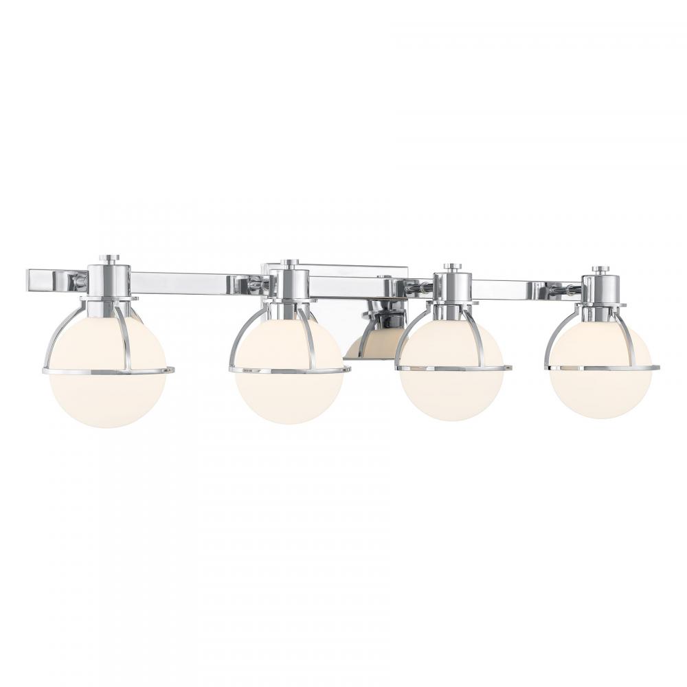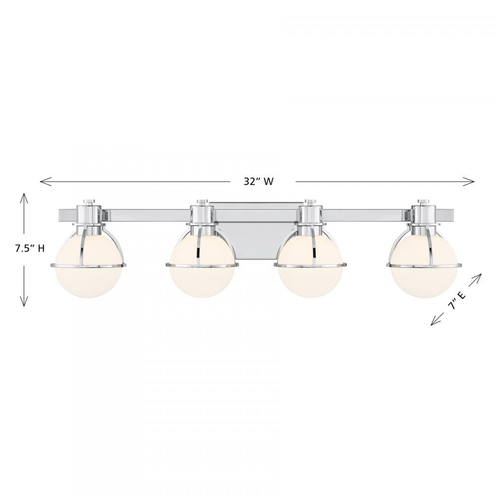 The Savoy House Pierce 4-light bath light offers up a retro, factory-inspired style that makes it an excellent choice for stylish bathroom lighting. Slender, curving half-cages finished in Chrome securely hold orbs of white opal glass that will provide a bright and welcoming glow. Pierce is 7.5" in height, 32" in width and extends 7" from the wall. Uses four G9 style bulbs of up to 60 watts per bulb. Bulbs not included. Install as shown. This bath bar is damp area rated.