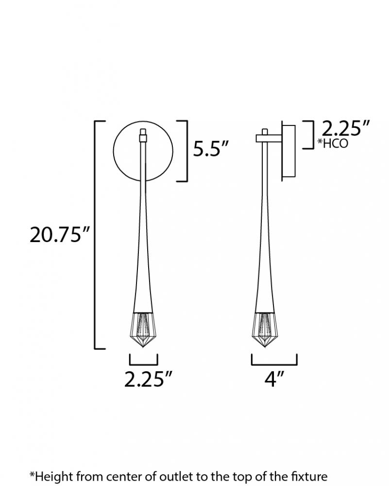An elongated profile with piercing statement, this series of pendants feature thin black wires that support a tapered metal pendant. Recessed in this form is a high powered LED that illuminates a brilliantly faceted crystal element with etched details insi