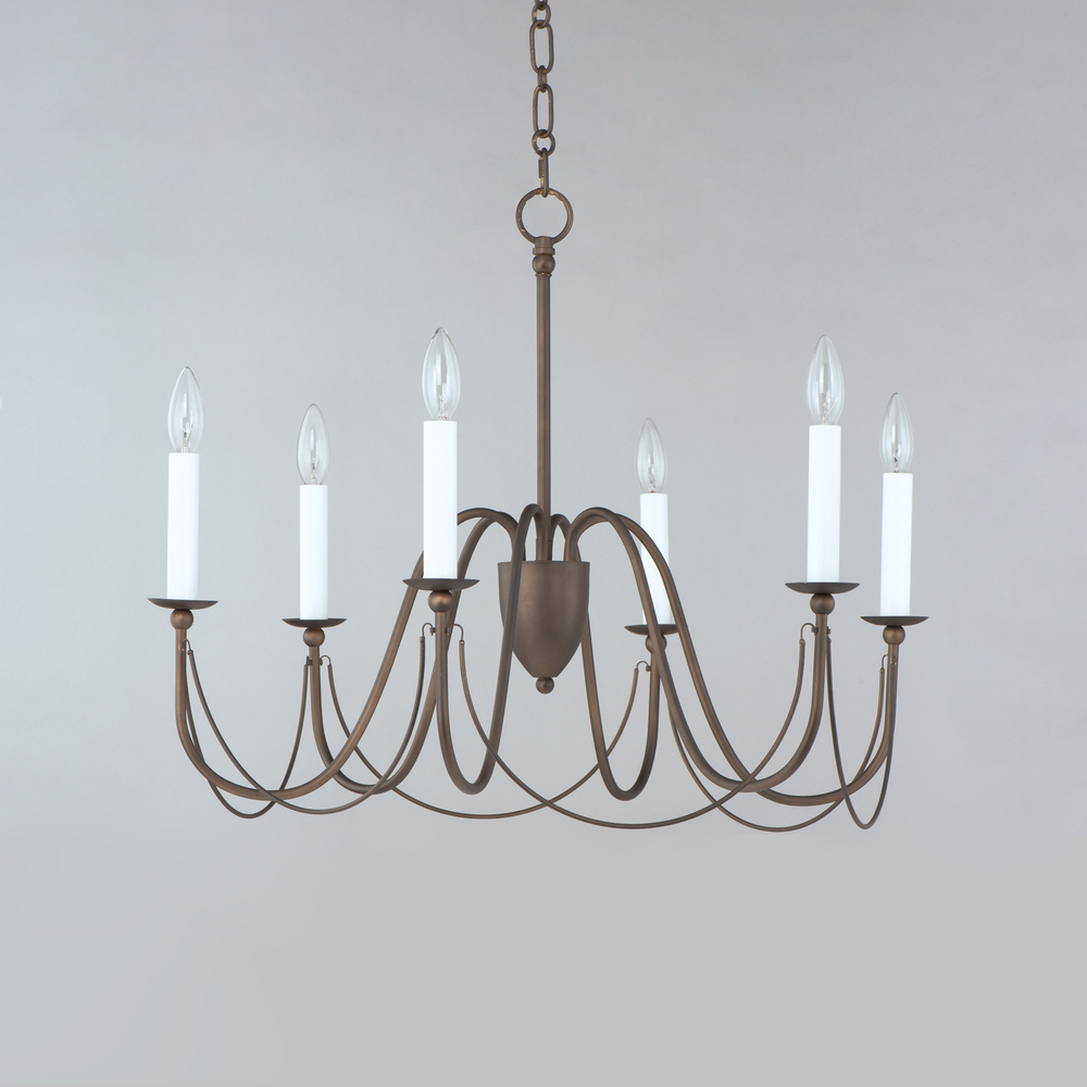 Sweeping metal accents links create classic curves on a minimalist chandelier. Available in hand-rubbed Chestnut Bronze or elegant Gold Leaf finishes. Add crystal accents to elevate the design for a more extravagant glamour. The design manages to evoke Fre
