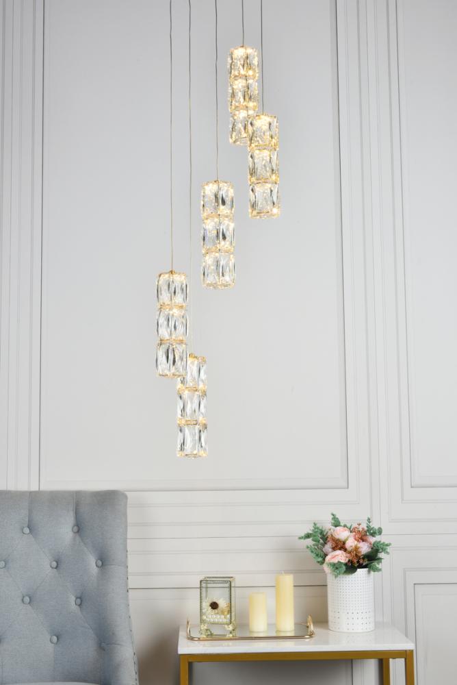 The Polaris collection is the epitome of "cool" in lighting, because each of the fixtures has rectangular, elegant-cut crystals that look like ice cubes, gracefully suspended from a stainless-steel base with a bright gold finish. Designed for rooms with higher ceilings, these fixtures are definitely stylistic attention-getters.