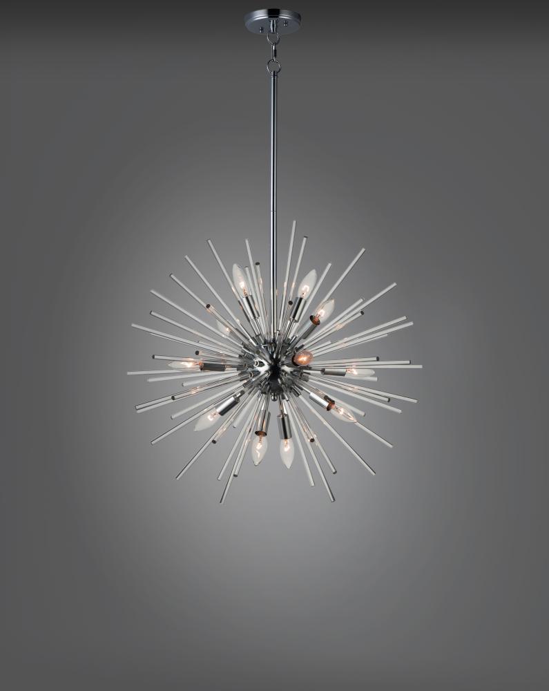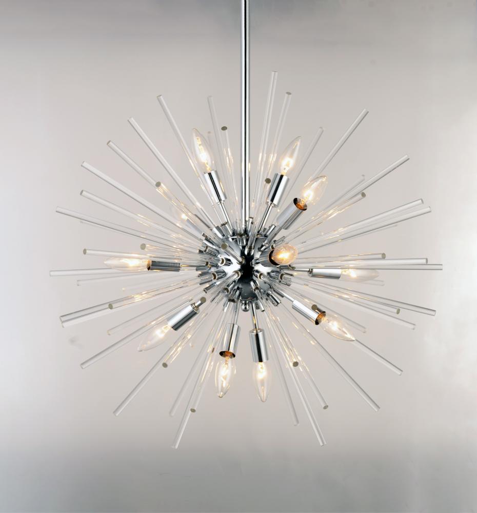 A dazzling burst of Clear glass rods extend from a classic sputnik shape finished in a bright Polished Chrome or warm Satin Brass. Available in two sizes of pendants and as a ceiling fixture, this unique look is a statement piece designed to attract attent