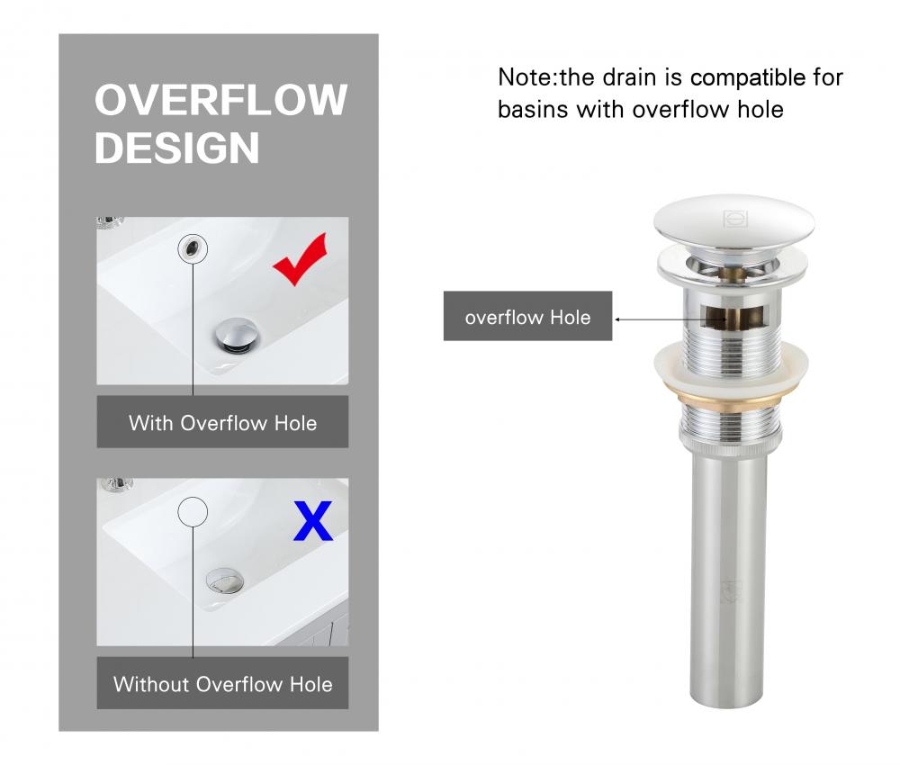 Features an integrated overflow hole, making it compatible with bathroom vanity sinks that include an overflow, preventing water spillage.