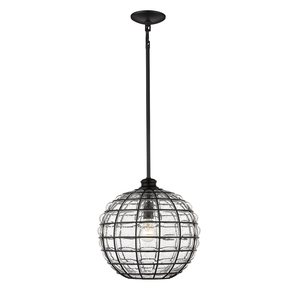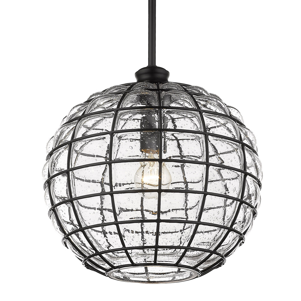 Powell is a collection of lovely glass and metal pendants. The decorative, mixed materials of the shades are the focus of these contemporary fixtures. To allow the shades to take center stage, the remaining matte black hardware is kept simple by design. Composed of curved iron, the shade?s metal ribbing forms an elongated sphere. Open at the bottom and handblown by artisans, the structured glass has an industrial-modern feel. During the blowing process, hot, molten glass pours through each crevice creating raised bubbles along the surface. As it cools, the seeded glass clings to the grid-like metal cage. When lit, the gently diffused shades have a unique glow. Beckoning onlookers, these lights add visual interest anywhere they hang.