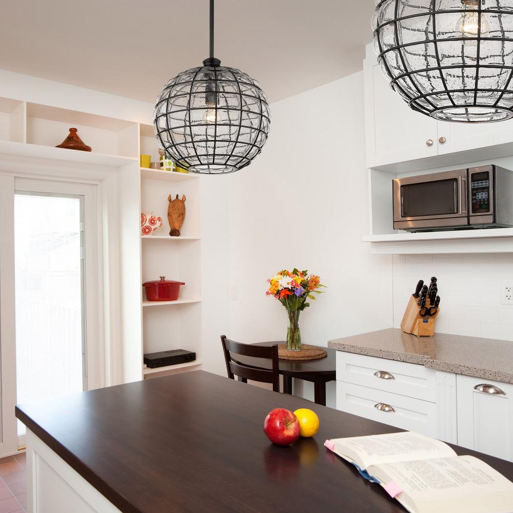 Powell is a collection of lovely glass and metal pendants. The decorative, mixed materials of the shades are the focus of these contemporary fixtures. To allow the shades to take center stage, the remaining matte black hardware is kept simple by design. Composed of curved iron, the shade’s metal ribbing forms an elongated sphere. Open at the bottom and handblown by artisans, the structured glass has an industrial-modern feel. During the blowing process, hot, molten glass pours through each crevice creating raised bubbles along the surface. As it cools, the seeded glass clings to the grid-like metal cage. When lit, the gently diffused shades have a unique glow. Beckoning onlookers, these lights add visual interest anywhere they hang.