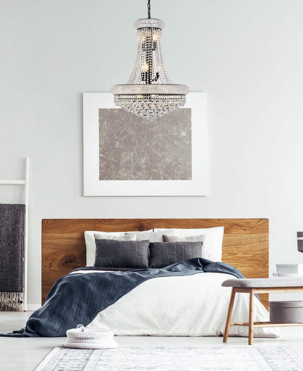The primo series of hanging fixtures comes in finishes of brilliant chrome or gold or black, which are refracted in the clear crystals.
