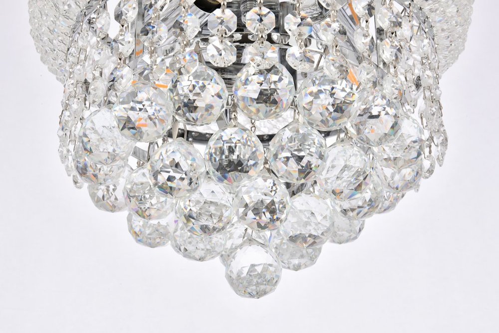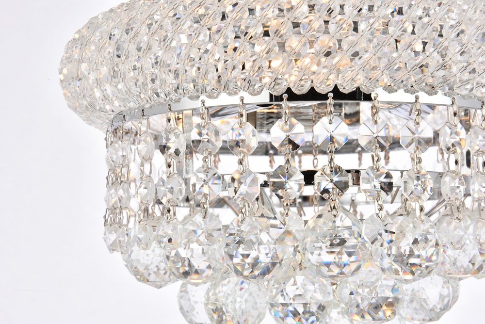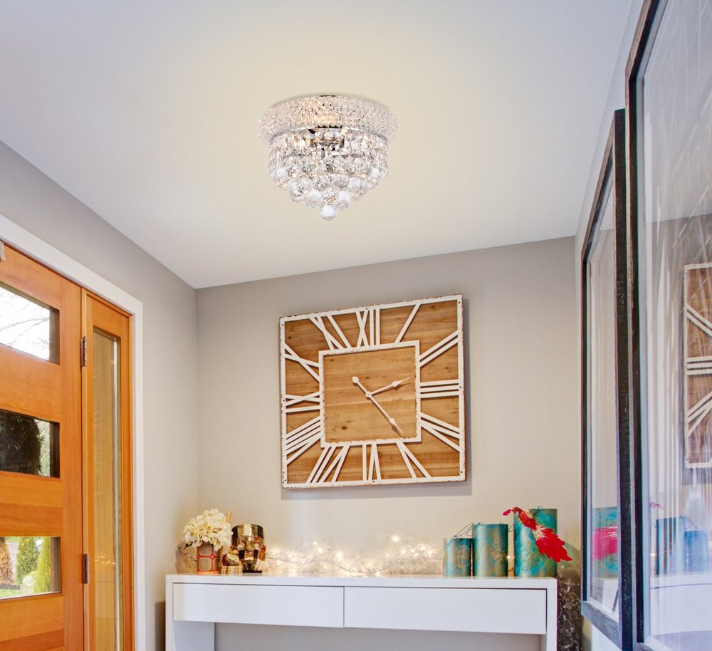Primo flush-mount fixtures come in finishes of brilliant chrome or gold, which are refracted in the clear crystals