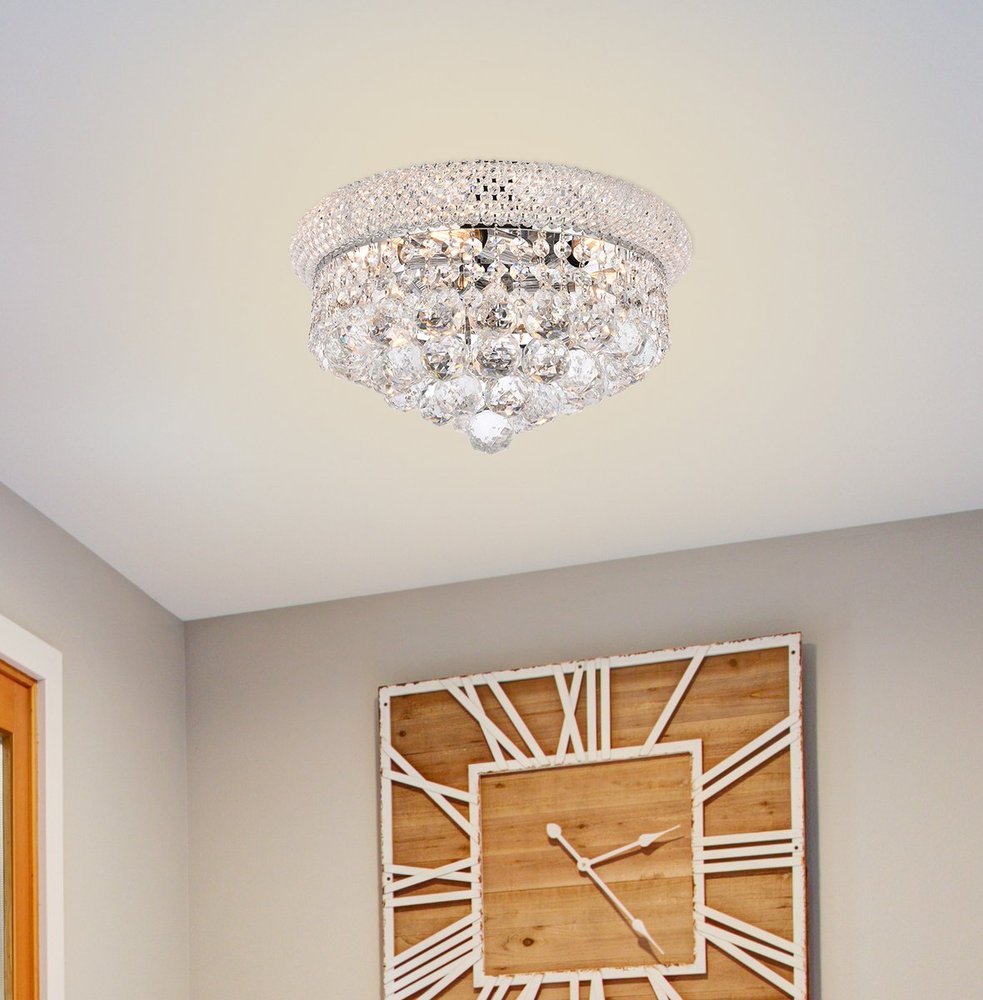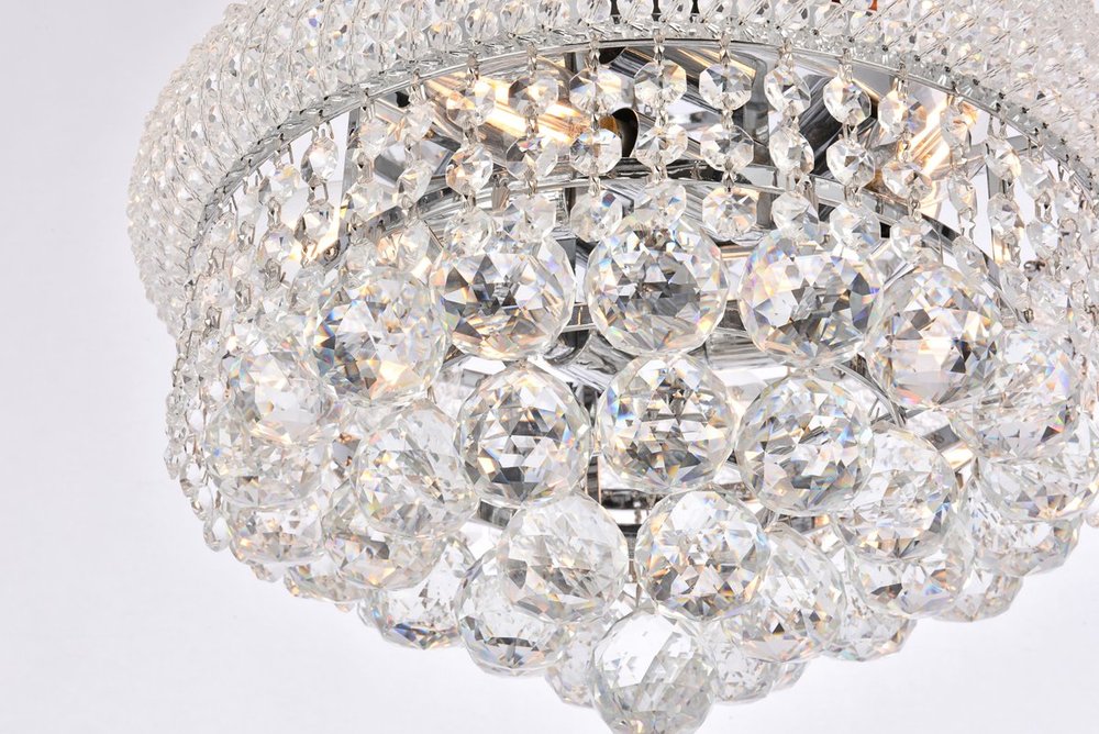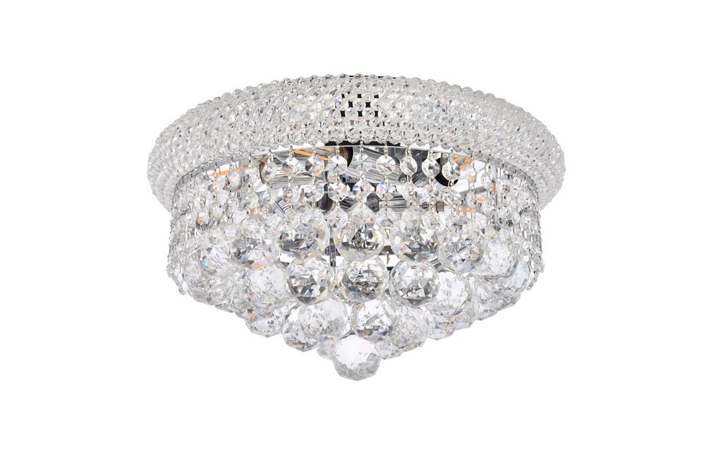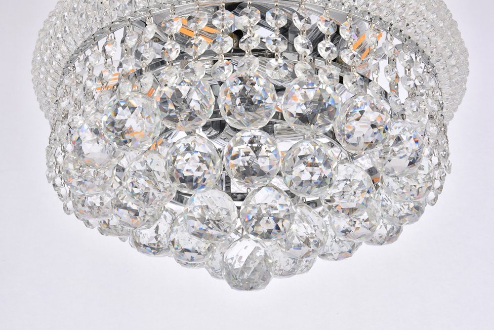 Primo flush-mount fixtures come in finishes of brilliant chrome or gold, which are refracted in the clear crystals