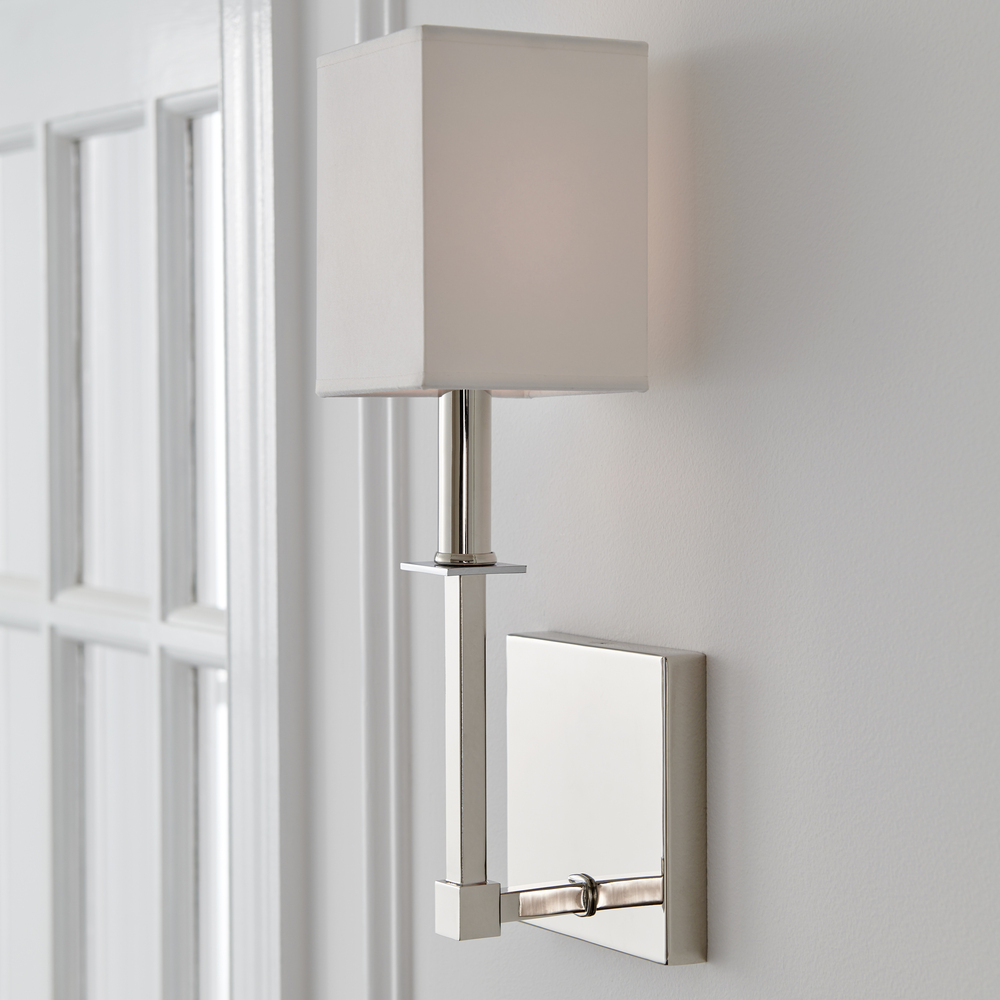 The Quinn Collection of Wall Sconce lighting is simply elegant with contemporary flair, featuring bold, cast details like square arms with a defined square transitional edge, contrasted by a circular candle tube sitting atop a square bobeche. A delicate White Parchment shade softly diffuses the light. Overall, the angular profile achieves a tailored, modern look for those seeking an updated classic. Quinn 1-light wall sconces are offered in a Satin Nickel or Antique Bronze finish and measure 15"H x 5"W and extend 5" out from the wall.