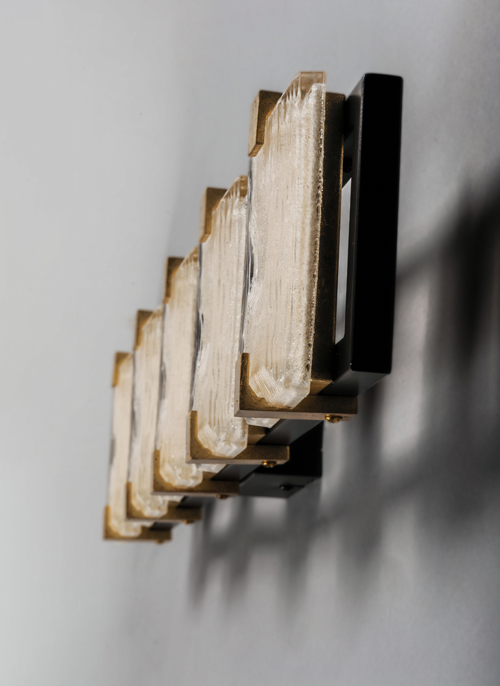 Piastra style glass diffuses integrated LED to shimmer radiantly. Suspended on a Black frame with Gold Leaf accents, this perfect blend of contemporary and traditional design adds glamour to a broad spectrum of design aesthetics.