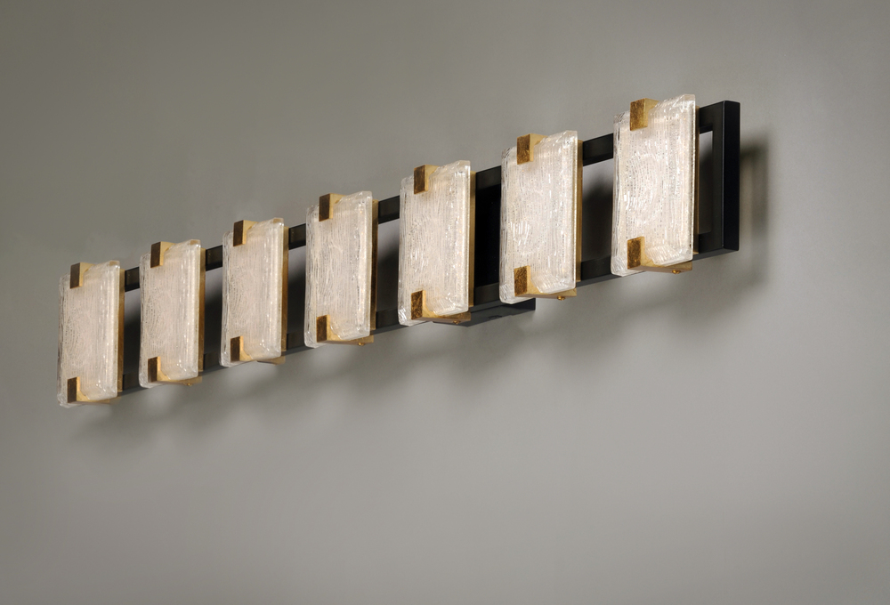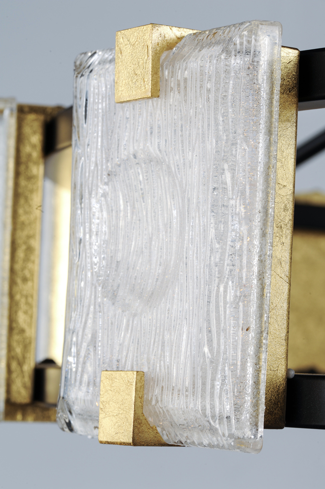 Piastra style glass diffuses integrated LED to shimmer radiantly. Suspended on a Black frame with Gold Leaf accents, this perfect blend of contemporary and traditional design adds glamour to a broad spectrum of design aesthetics.