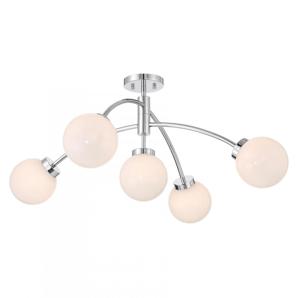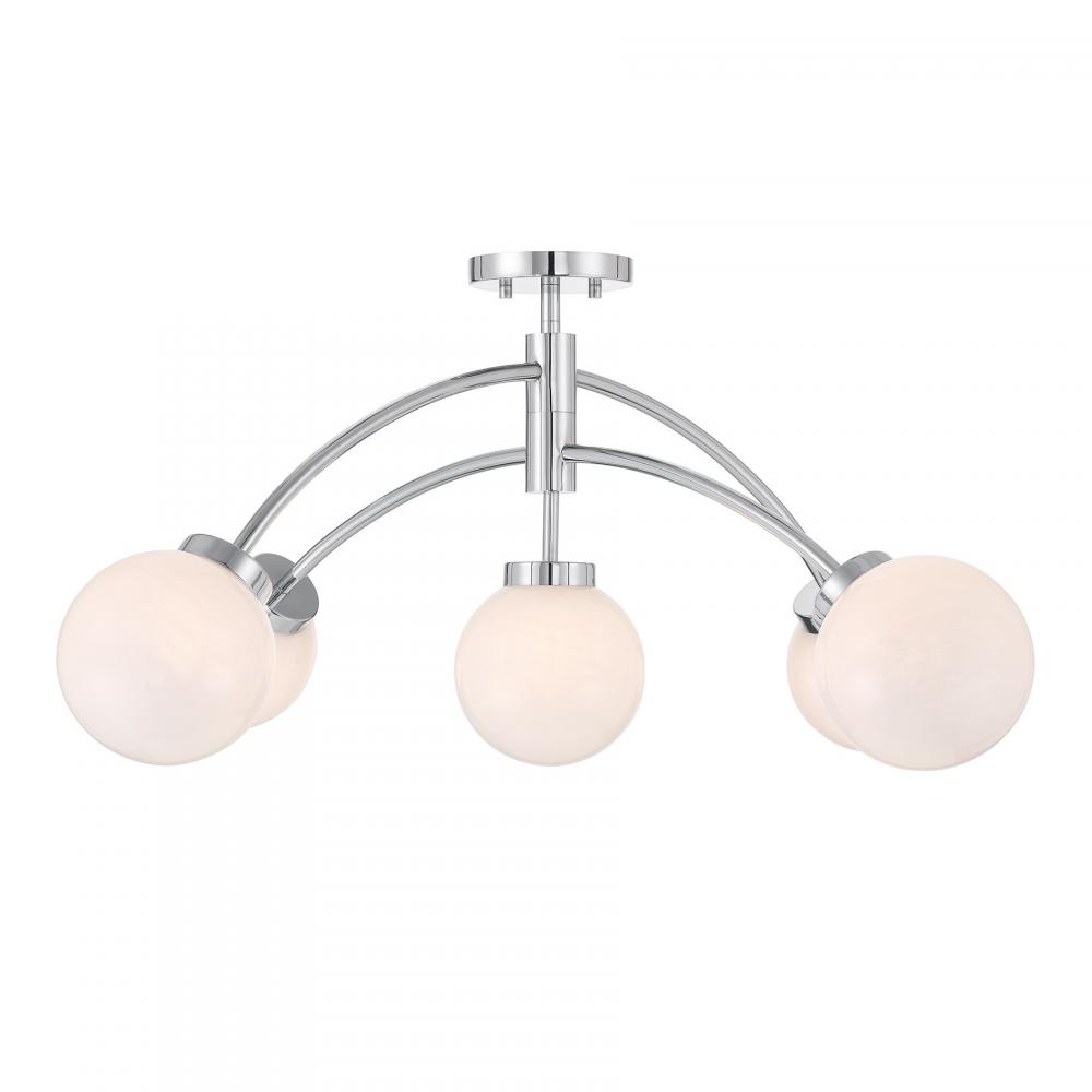 Bring in the big, bright and bold Savoy House Redfield 5-light semi-flush mount! Dazzling with mid-century modern inspiration, its curving arms hold orbs of swirling, stunning white strie glass that pairs beautifully with the Chrome finish. Redfield is 16" in height and 36" in width, making it an excellent choice for illuminating large rooms. It uses five G9 LED bulbs of up to 3.5 watts per bulb. Bulbs not included.