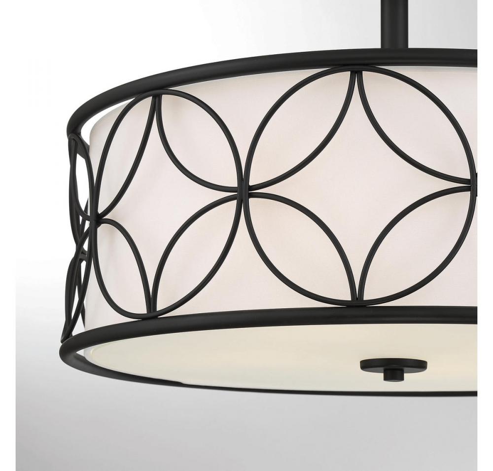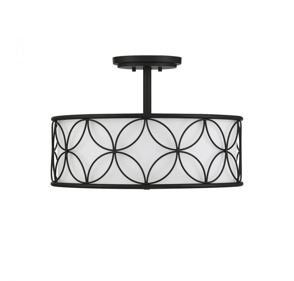 A beautiful geometric pattern adorns this Savoy House Reid 4-light ceiling light. Finished in matte black, the pattern pops brightly against the inner white fabric shade. Reid is perfect for boosting the illumination in any room, even smaller spaces. It is 13.5" in height and 20" in diameter. It uses four standard size bulbs of up to 60 watts per bulb.