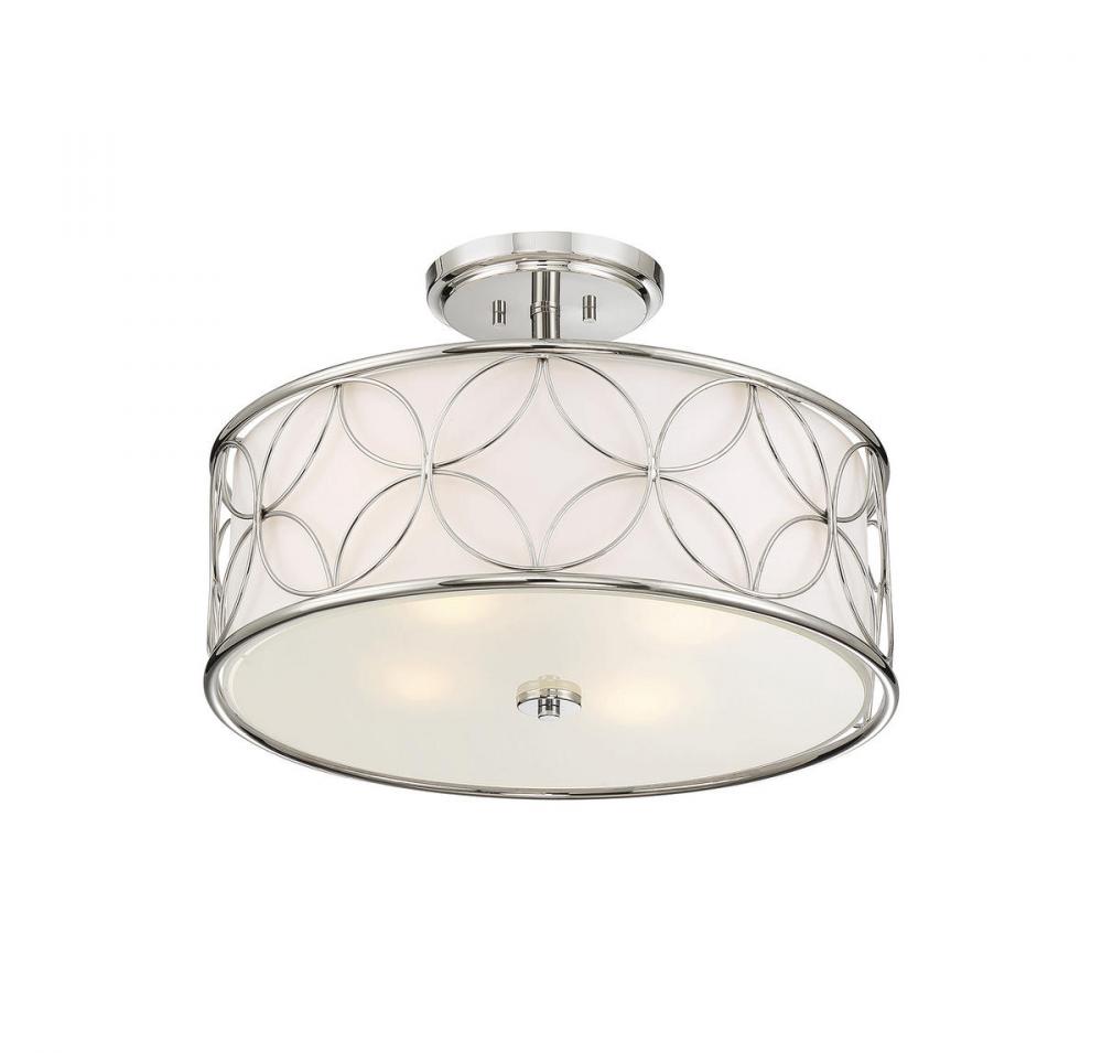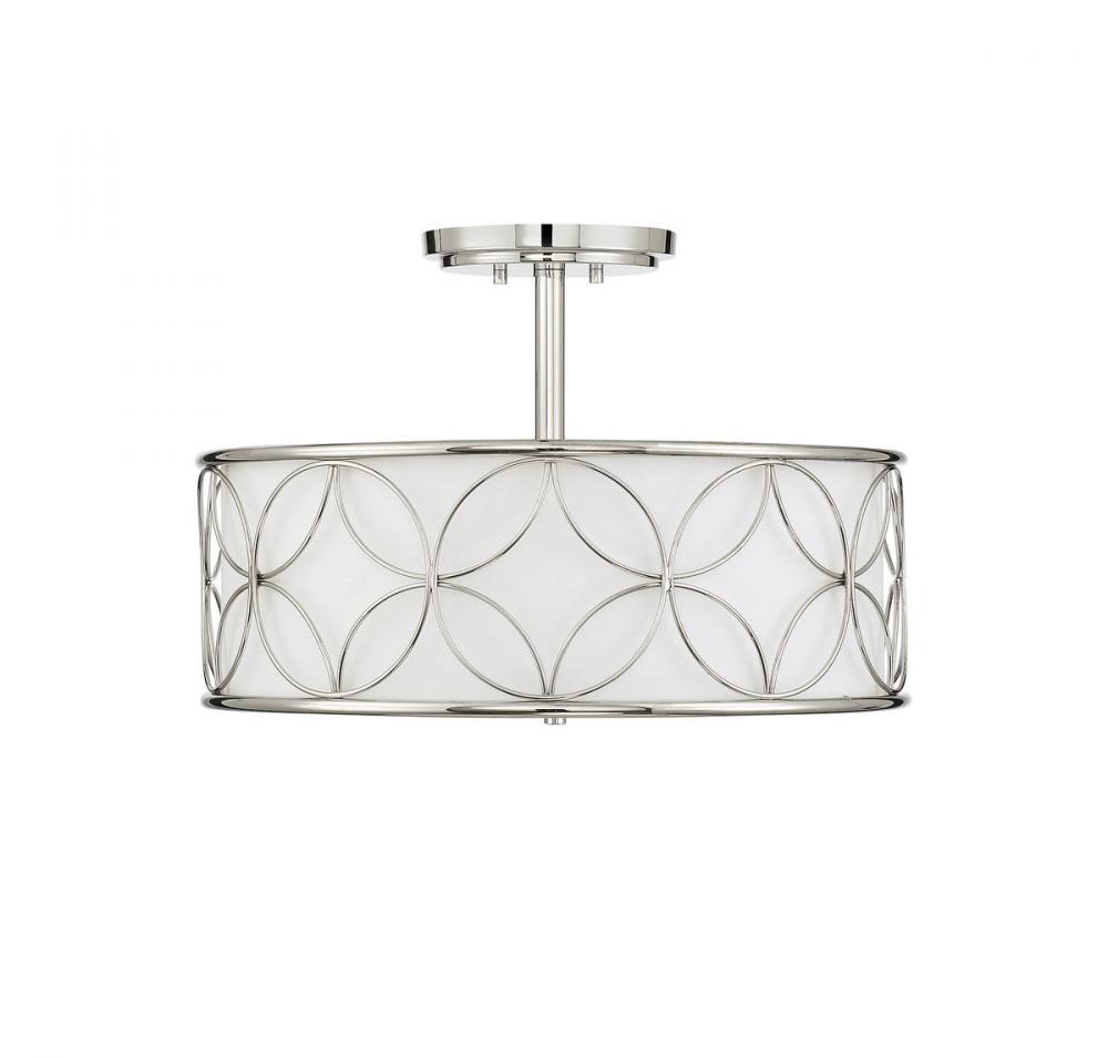 A beautiful geometric pattern adorns this Savoy House Reid 4-light ceiling light. Finished in polished nickel, the pattern pops brightly against the inner white fabric shade. Reid is perfect for boosting the illumination in any room, even smaller spaces. It is 13.5" in height and 20" in diameter. It uses four standard size bulbs of up to 60 watts per bulb.