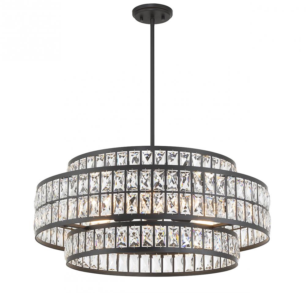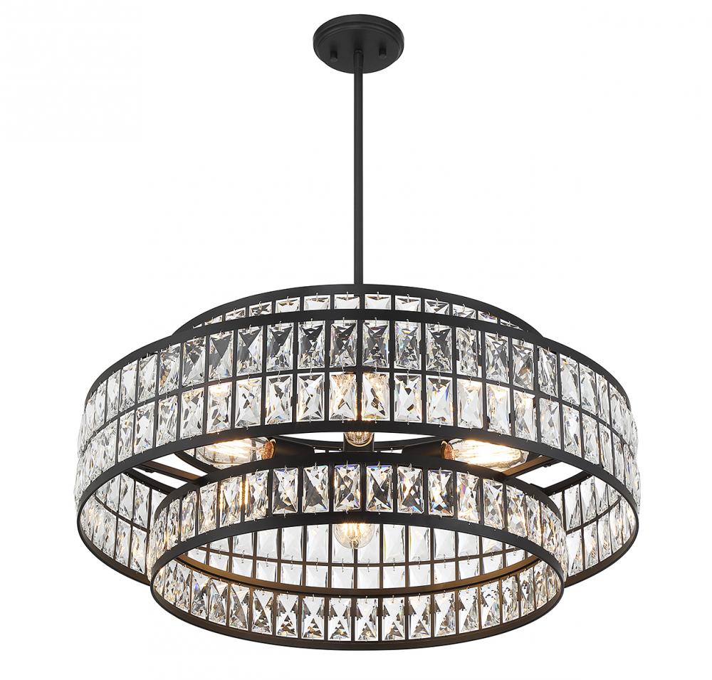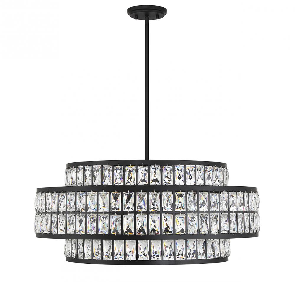 It is often said that lighting is the jewelry of the home and the Savoy House Renzo 6-light pendant is a perfect example of this saying. Faceted clear crystal decorates the two layers of shades, which overlap in an intriguing way and are finished in matte black. Renzo is 28" in width and has an adjustable height ranging from 12.5" to 66". Comes with four 12" downrods and one 6" downrod. It uses 6 standard size bulbs of up to 60 watts per bulb (bulbs not included).