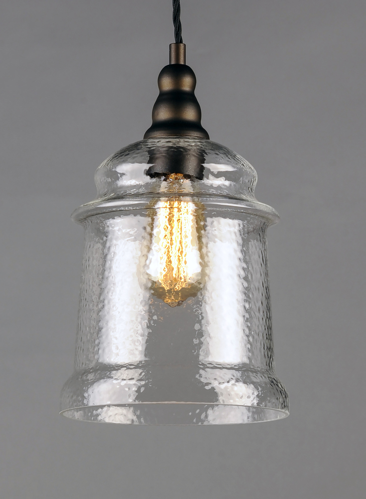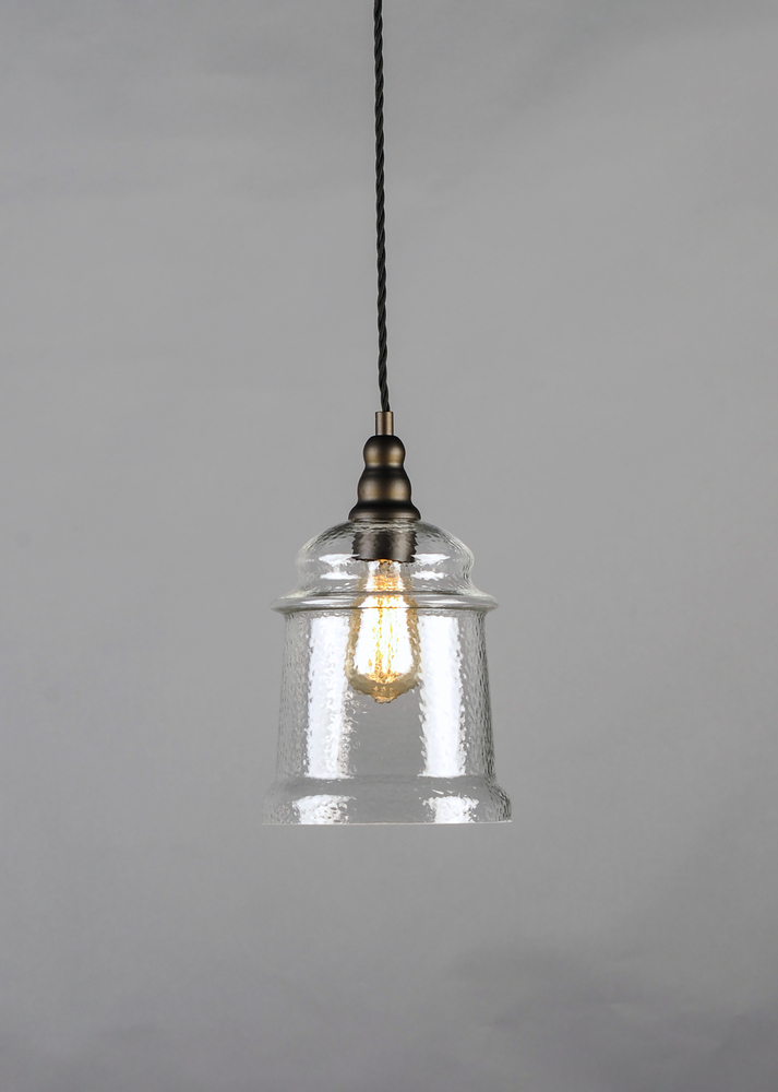 Metal frames of Oil Rubbed Bronze are draped with a twisted fabric wire for that authentic detail. Clear Hammered glass shades suspend from the twisted wire reminiscent of yesteryear. The restoration style of this collection lives on forever.