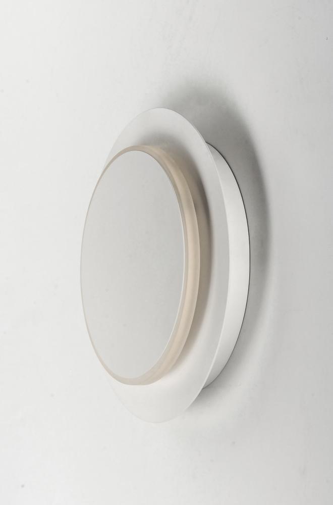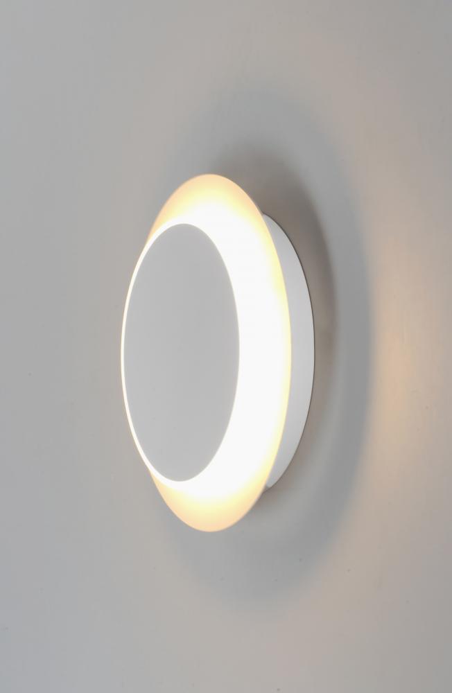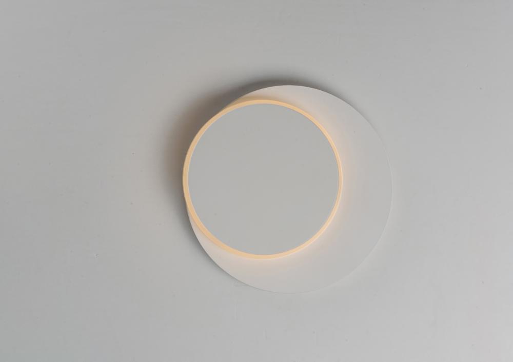 The exterior section of this fixture is lit on the edge and rotates from the top creating a halo effect on the surface behind. Available in either a wall or ceiling fixture is created in two sections finished in Matte White.