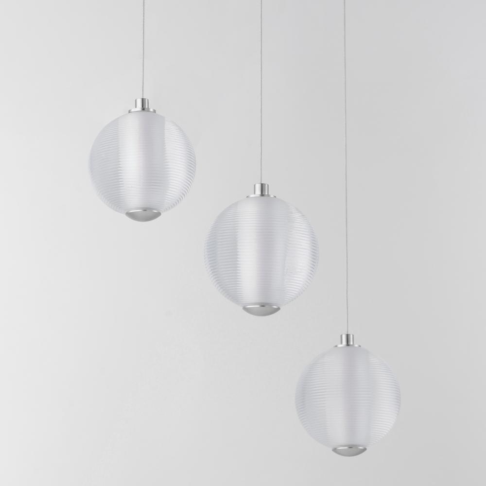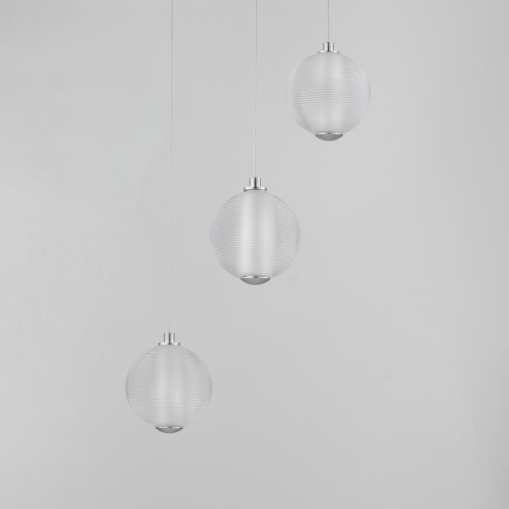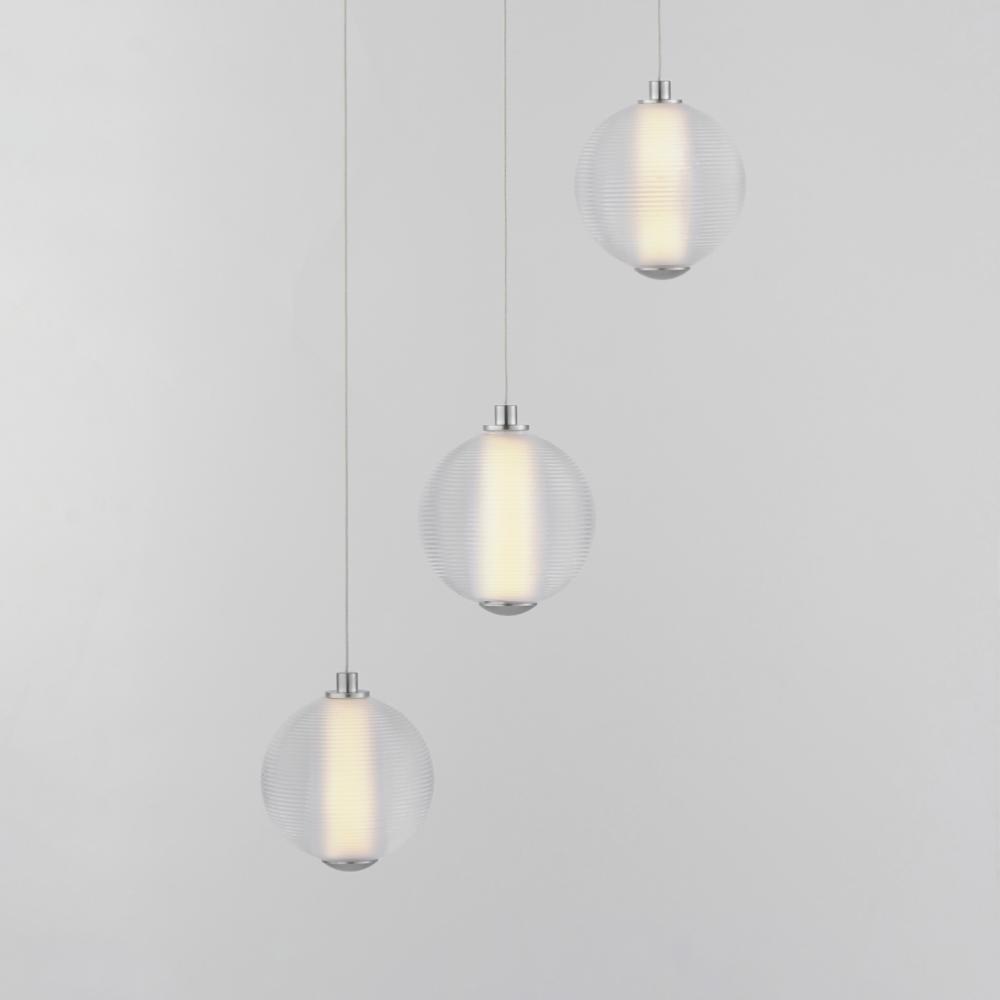 Ablaze with omnidirectional LED light radiating from the center of perfectly ribbed spheres, the lustrous glow within accentuates the repeating pattern on the glass' exterior. With minimal hardware visible outside the glass, select from Polished Chrome