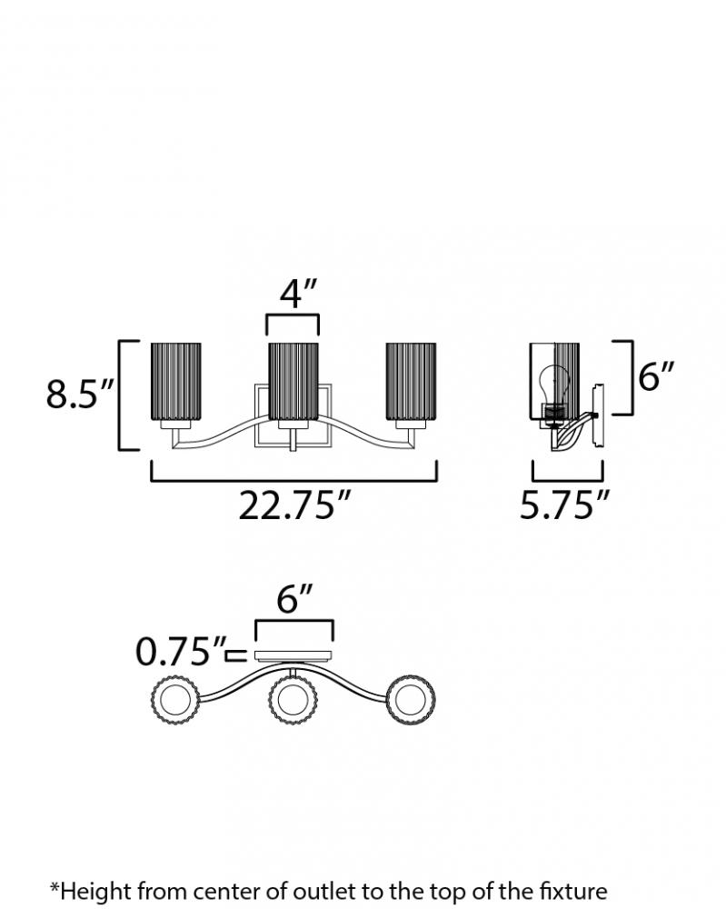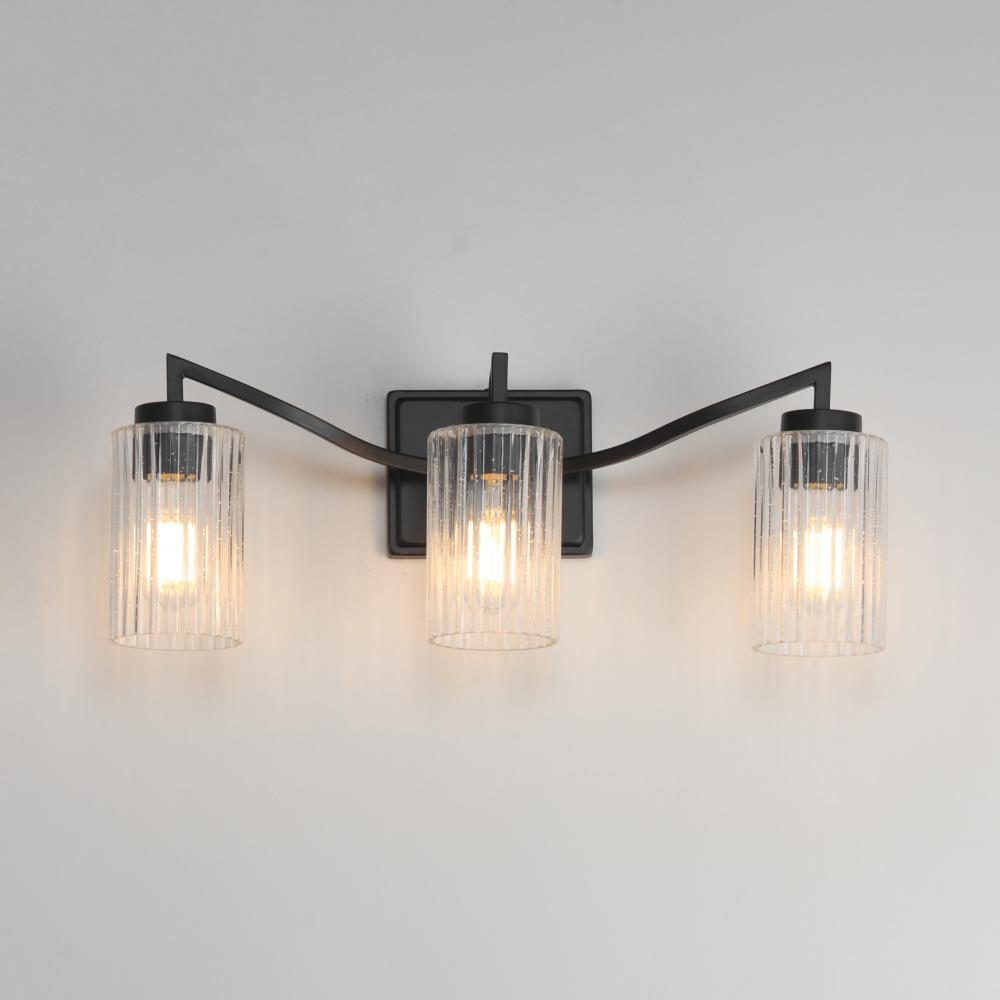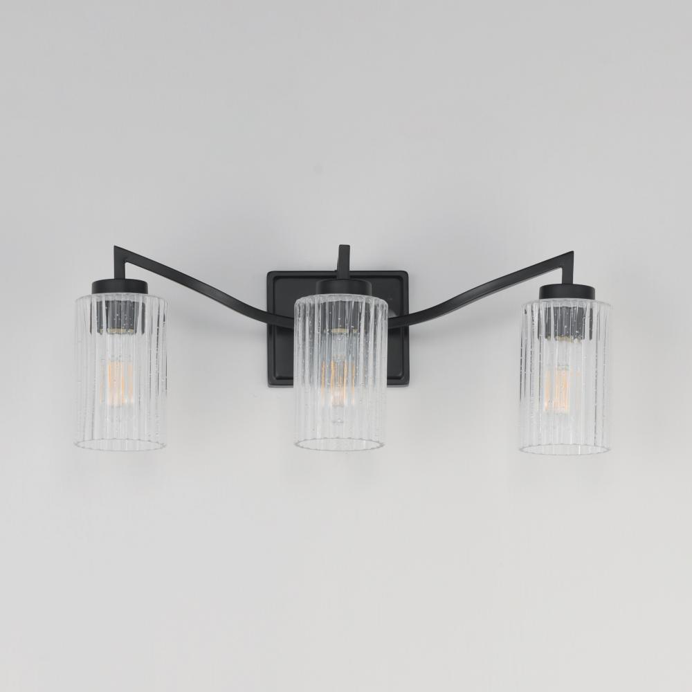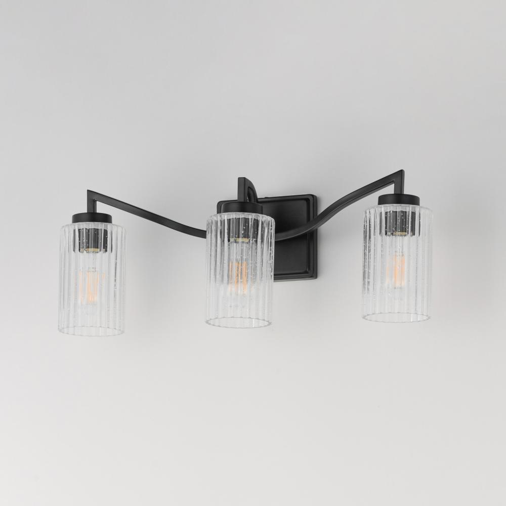 Clear Ribbed glass cylinders are supported on gracefully sweeping frames. The glass pattern helps to diffuse the light source while adding texture and style to the design. Available in Polished Nickel, Satin Champagne, or Matte Black.