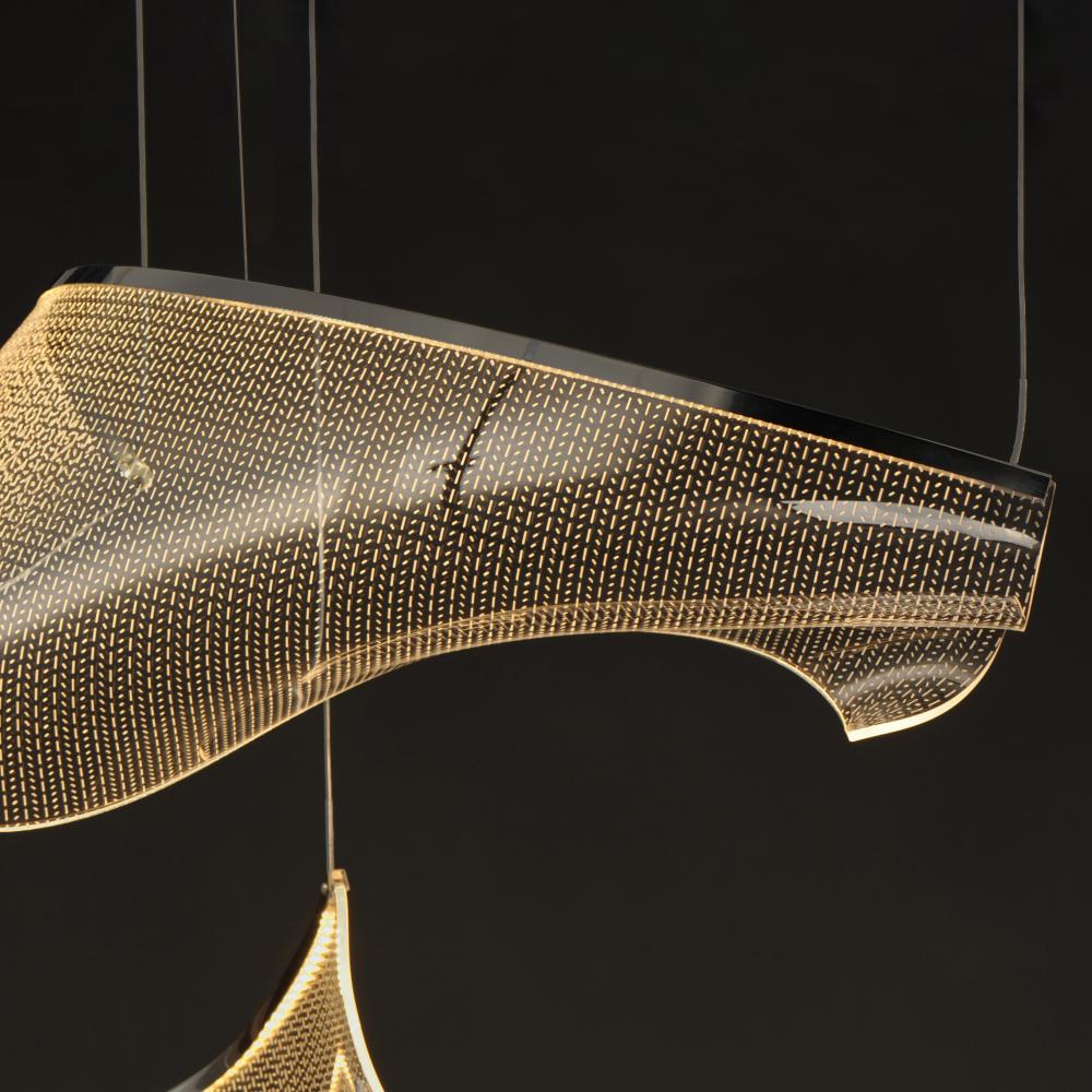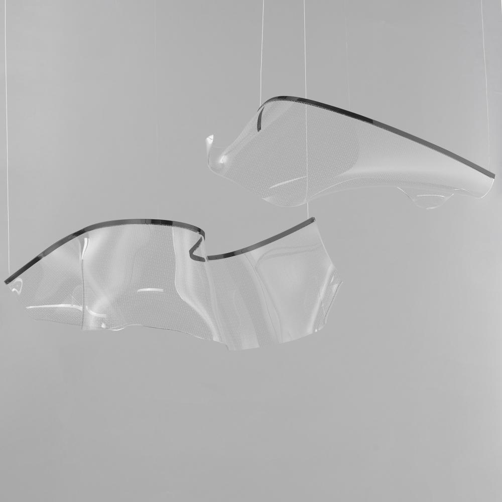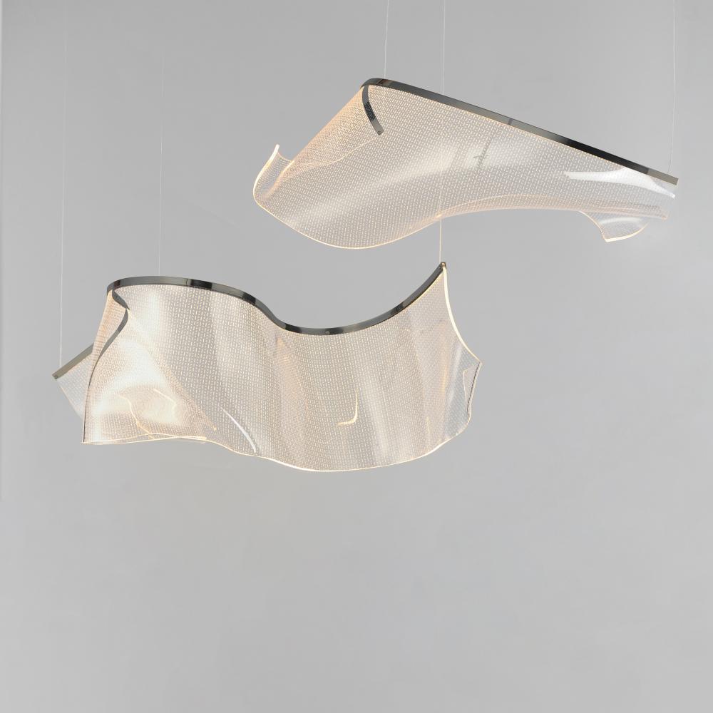 An airy arrangement of abstract forms, the Rinkle pendants feature sheets of transparent acrylic shaped by hand. The light guided acrylic captures the glow of energy efficient LEDs recessed within strips of shining stainless steel, obscuring the source of