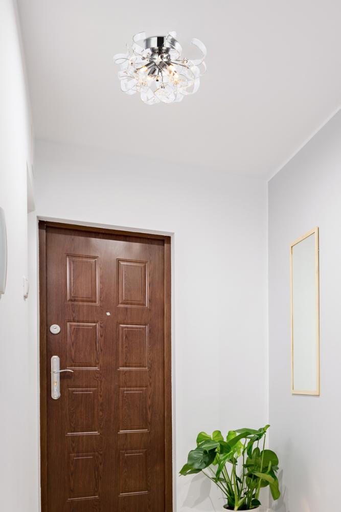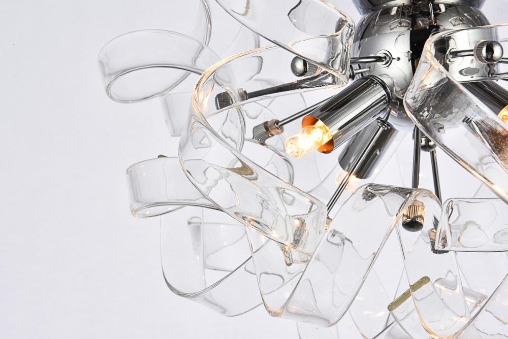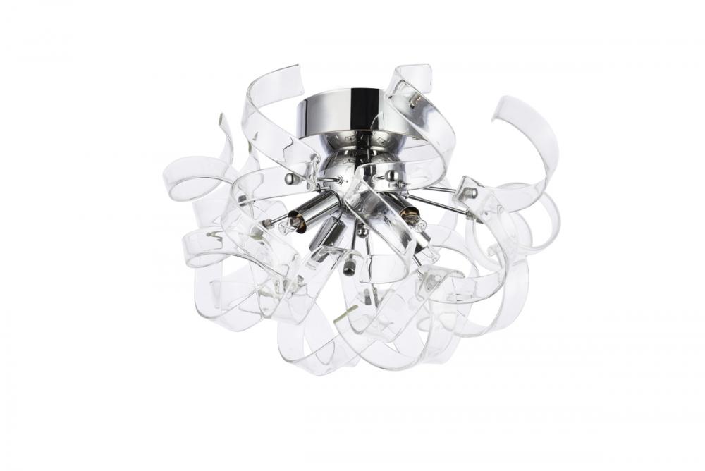 Intriguing Ritz flush-mount fixtures turn any space into a celebration. Like a decoration for a special present, the captivating hemisphere of delicate, curled ribbons of glass will create a relaxing ambience in any room. Four bright lights shine through this contemporary chrome-finished design. The Ritz collection is sure to delight in your dining room, living room, bedroom, bathroom, and entryway.