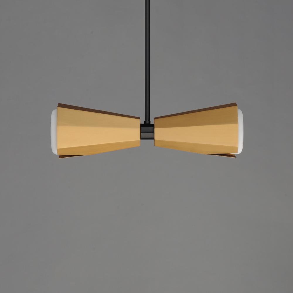 The Rizzo collection exudes stylish flair and spirited design, combining faceted metal shades in Natural Aged Brass with striking Matte Black accents. A flat-bottomed Satin White glass shade protrudes gracefully from the base of each metal shade, deliverin