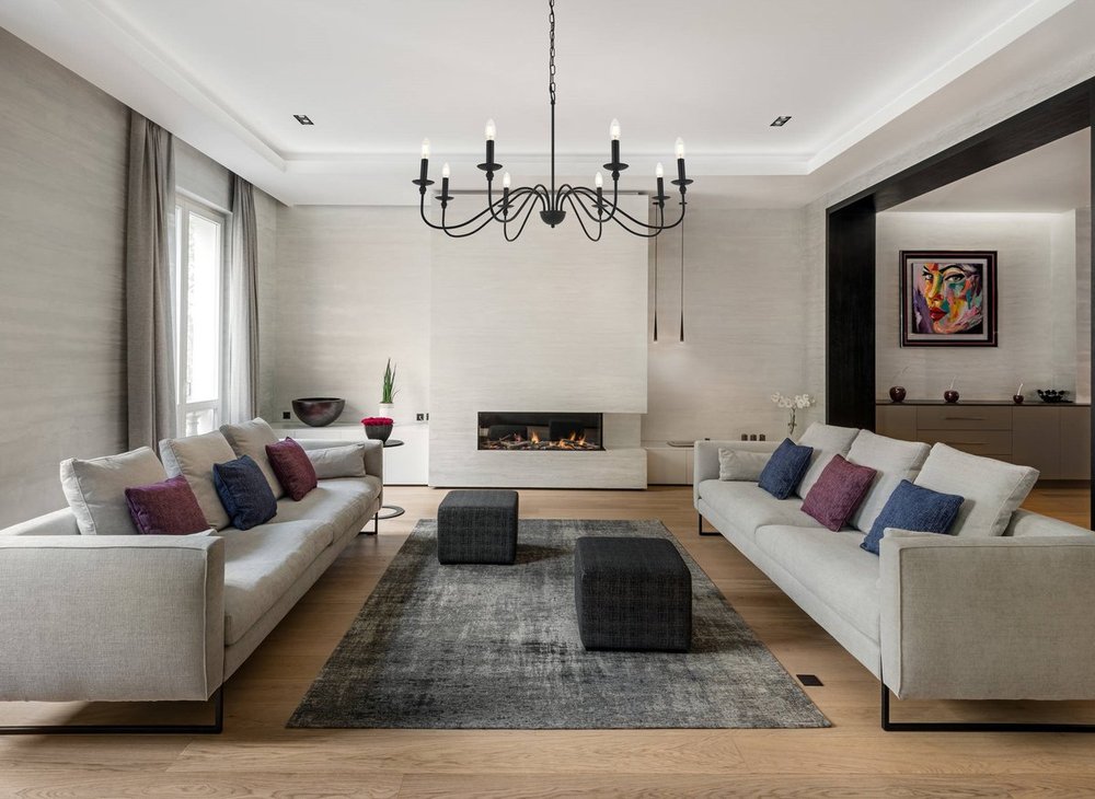 Minimalistic matte black chandelier pendant with 8 gently undulating arms and lights
