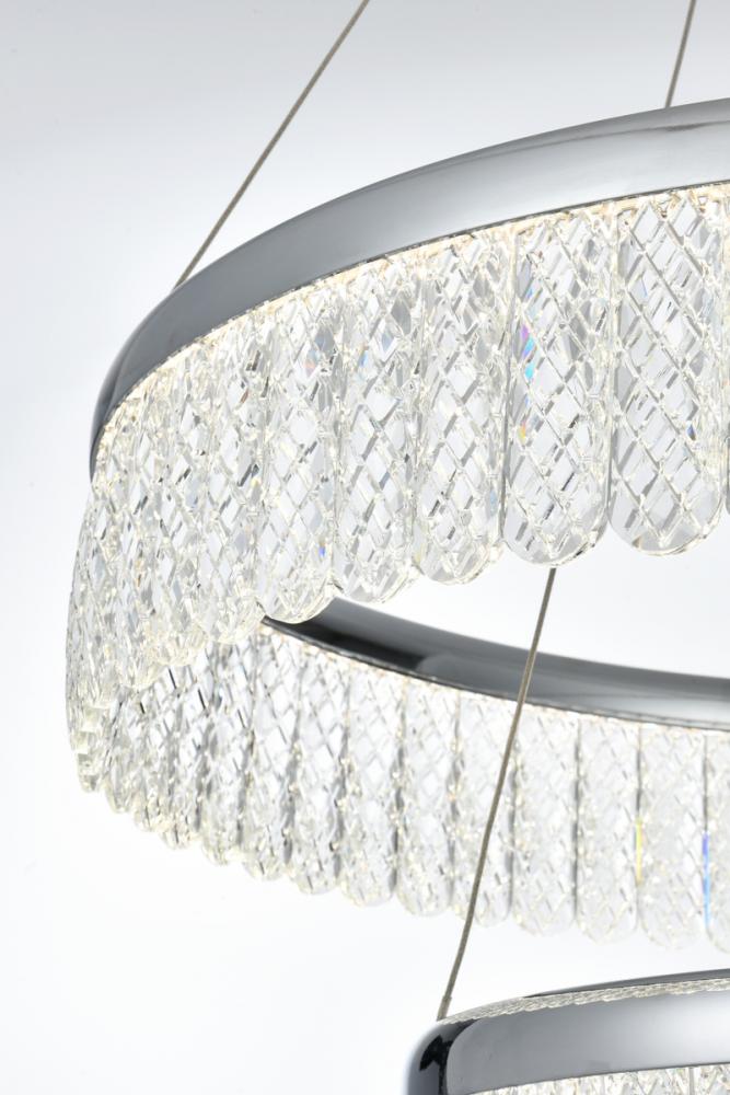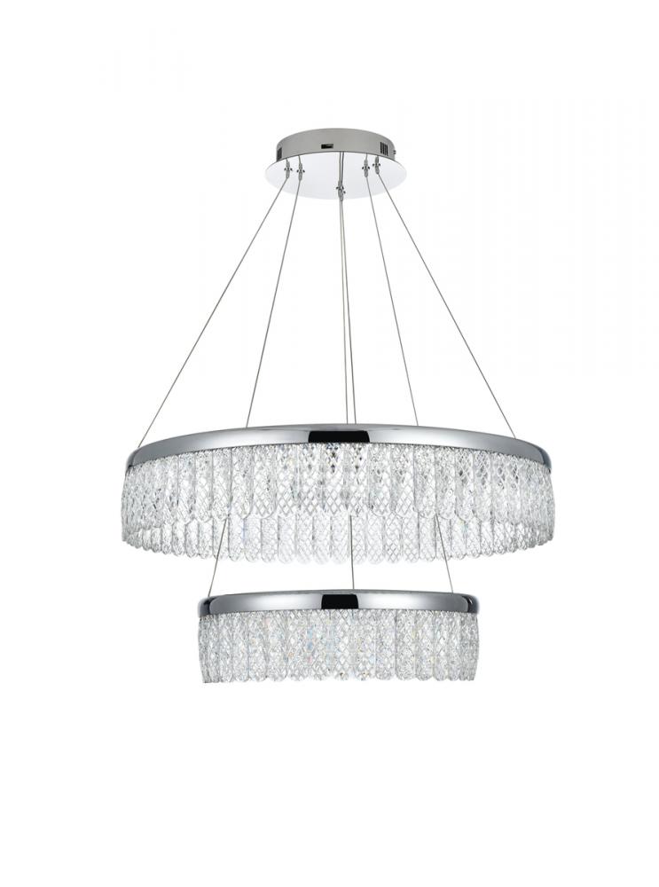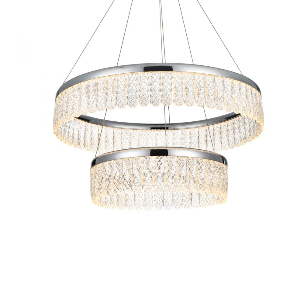 Our 24-inch Chandelier features two ring tiers, each adorned with crystals through which the light is gracefully illuminated, creating a captivating interplay of radiance and elegance in your space.