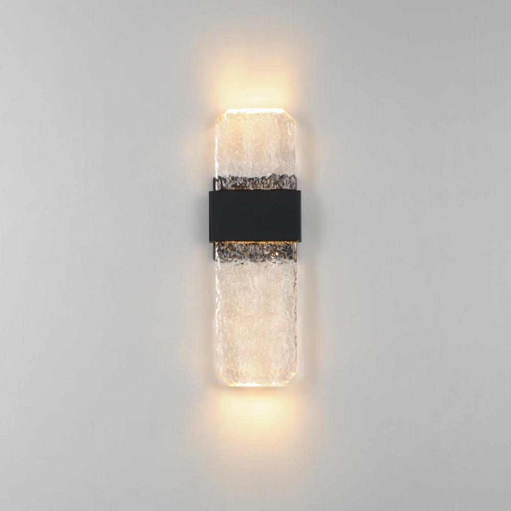 Artisanal cast glass slabs are supported by a Die Cast Aluminum bracket finished in an outdoor rated Black powder coat. Emphasizing the unique beauty of the glasses' imperfect contours, the sconces accentuate these features with concealed LED lighting.