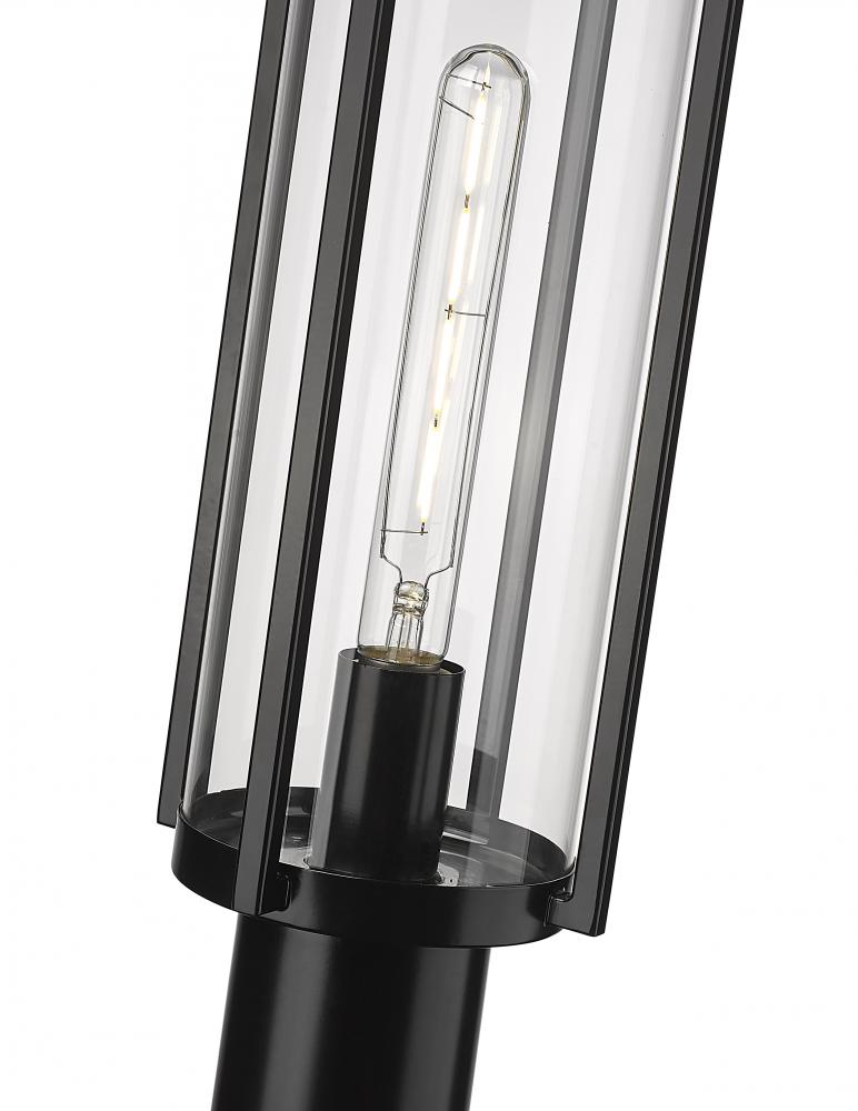 A bold steel framework encases a sparkling clear glass cylinder, giving the Russell Collection a unique appearance. These outdoor sconces are single, downward-facing lights that combine sleek styling with a powder coat black finish. Vintage-style elongated Edison bulbs will complete the look for an exciting addition to any entryway.