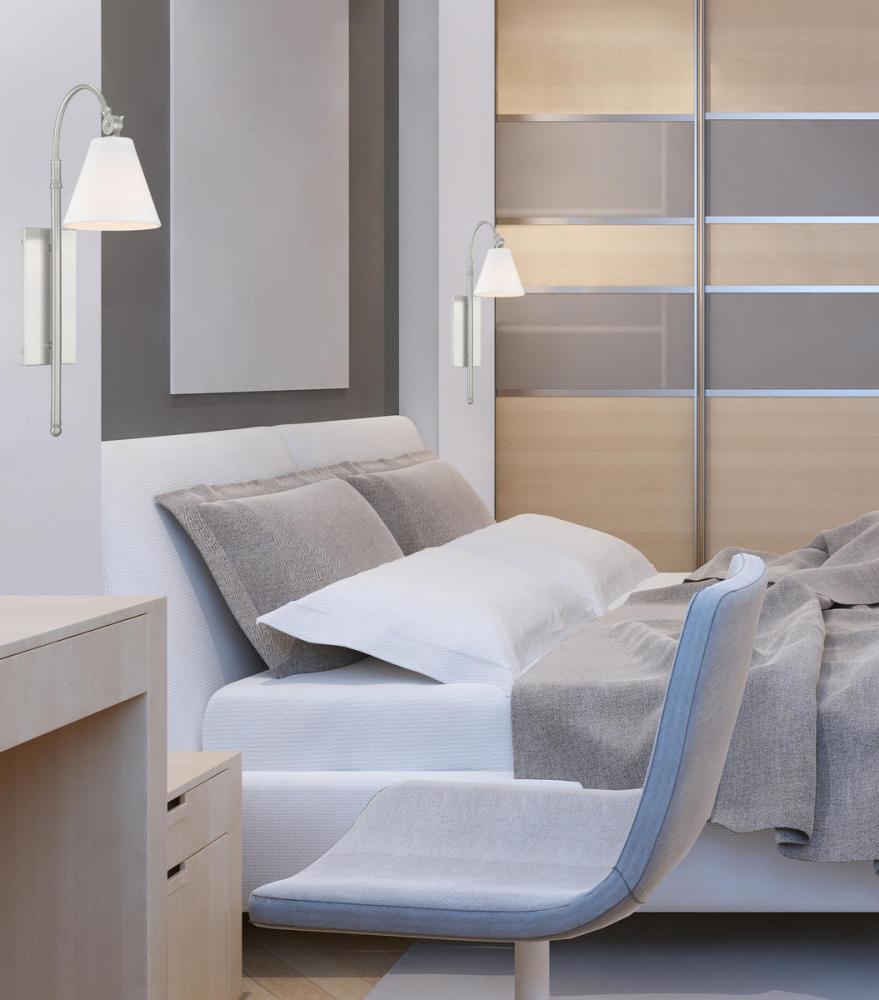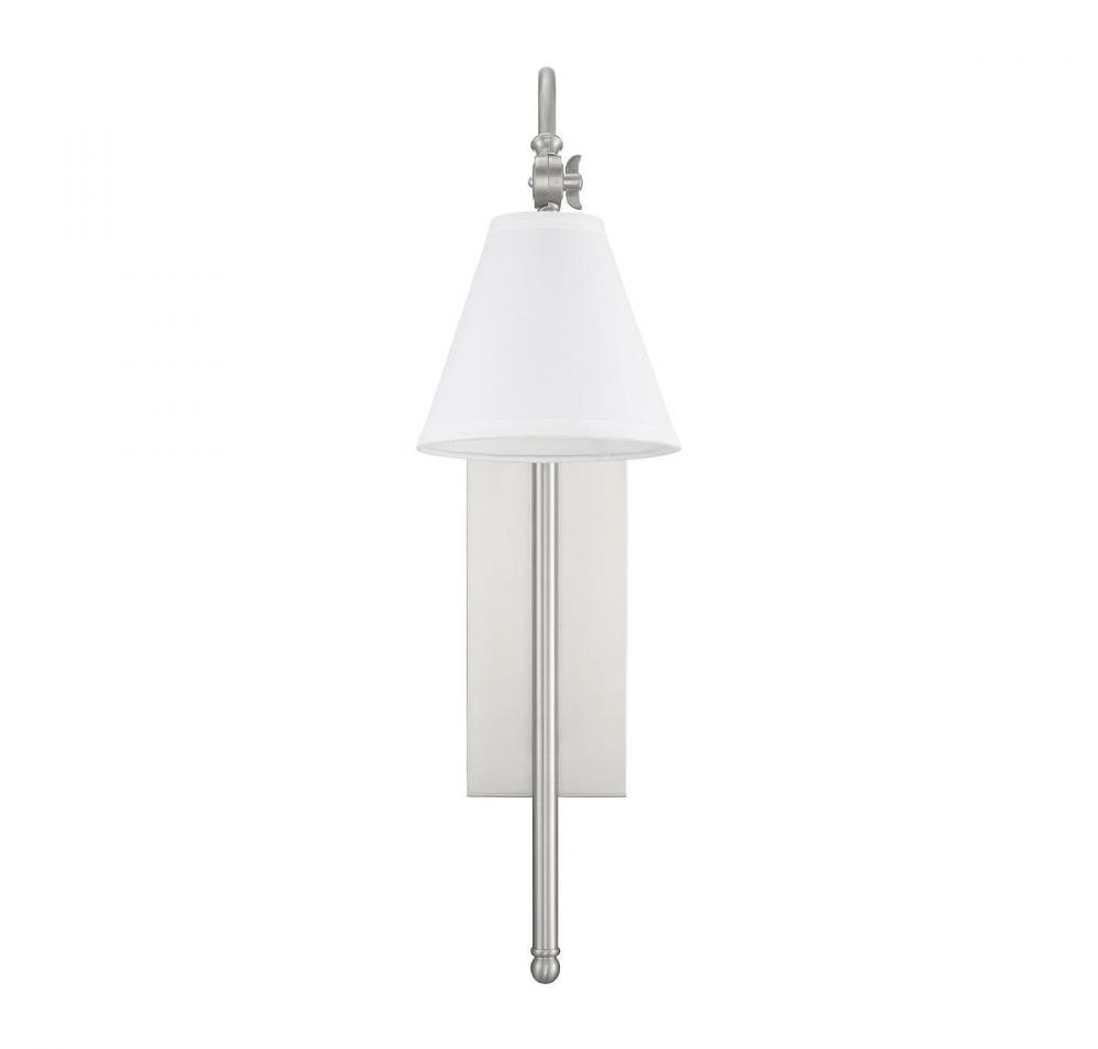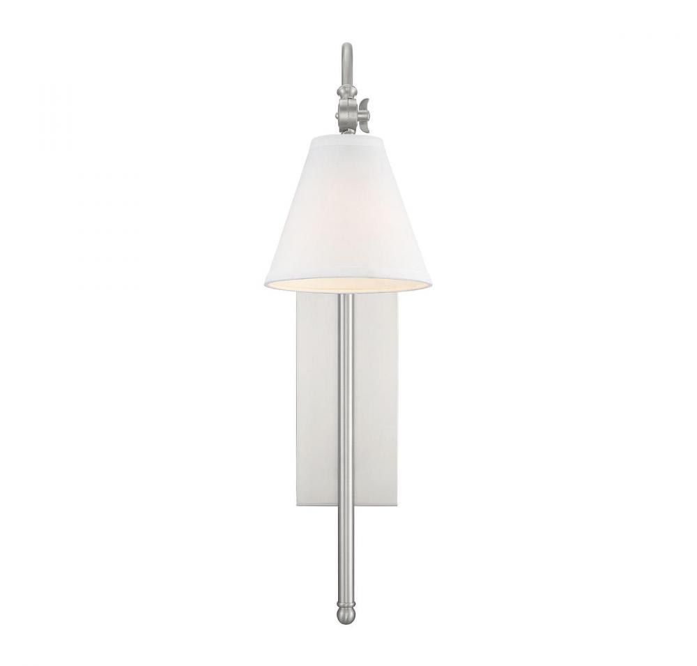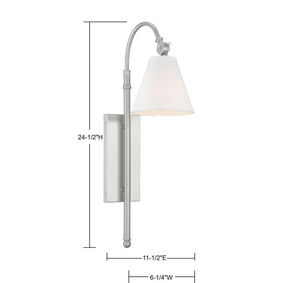 Sleek and contemporary! The Rutland wall sconce has fine, understated details and a fresh, polished appearance. It’s an impeccable choice for great design and soft light along the walls, especially with modern, farmhouse or transitional decor. The rectangular wall plate, long vertical tail and graceful curved light arm have a high-quality satin nickel finish. The conical shade is made of crisp white fabric, enclosing one 60W standard size bulb. The sconce measures 6.25" wide, 24.5" high and extends 11.5" from the wall, making it ideal to place alone, in pairs or in groups. It’s chic, modern style for your dining area, living room, entryway, family room, kitchen, bedroom, bathroom, hallway, office or great room.
