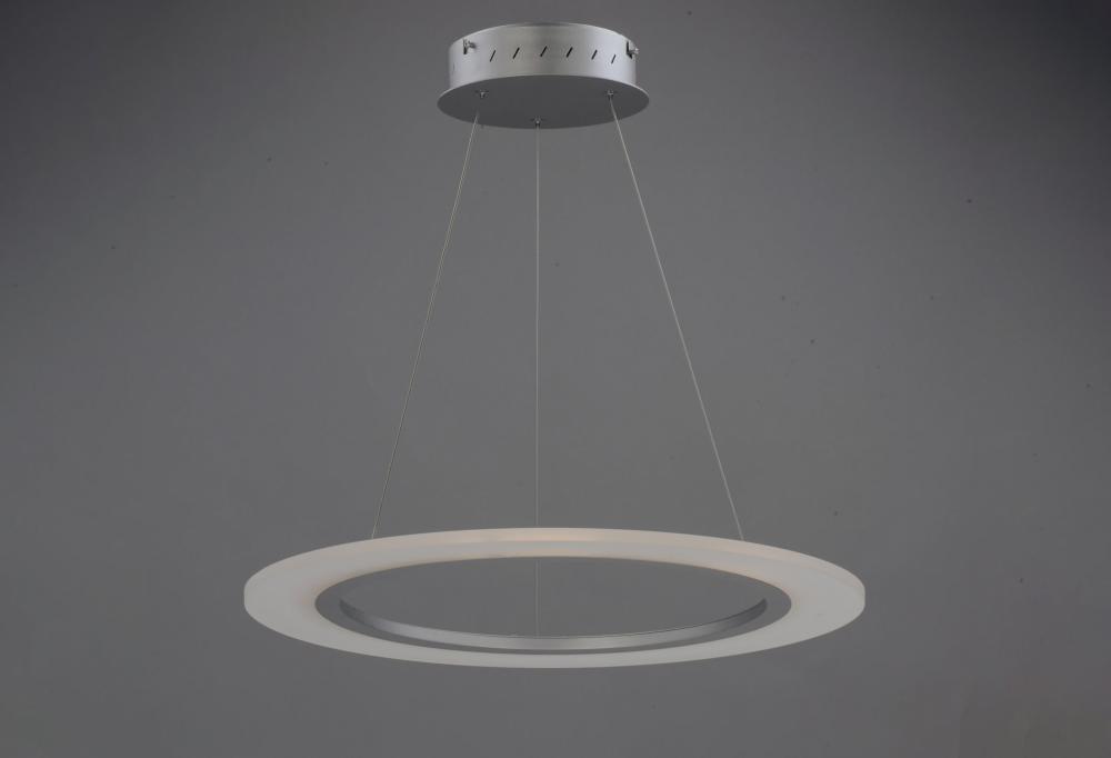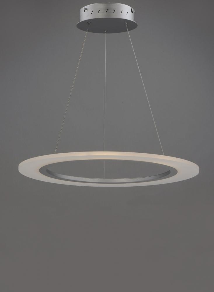 A new variation of a very popular series with many different configurations many of which are large scale for commercial applications. Metal rings of Matte Silver support horizontal acrylic diffusers which glow when illuminated by dimmable LED.