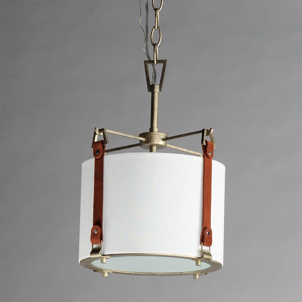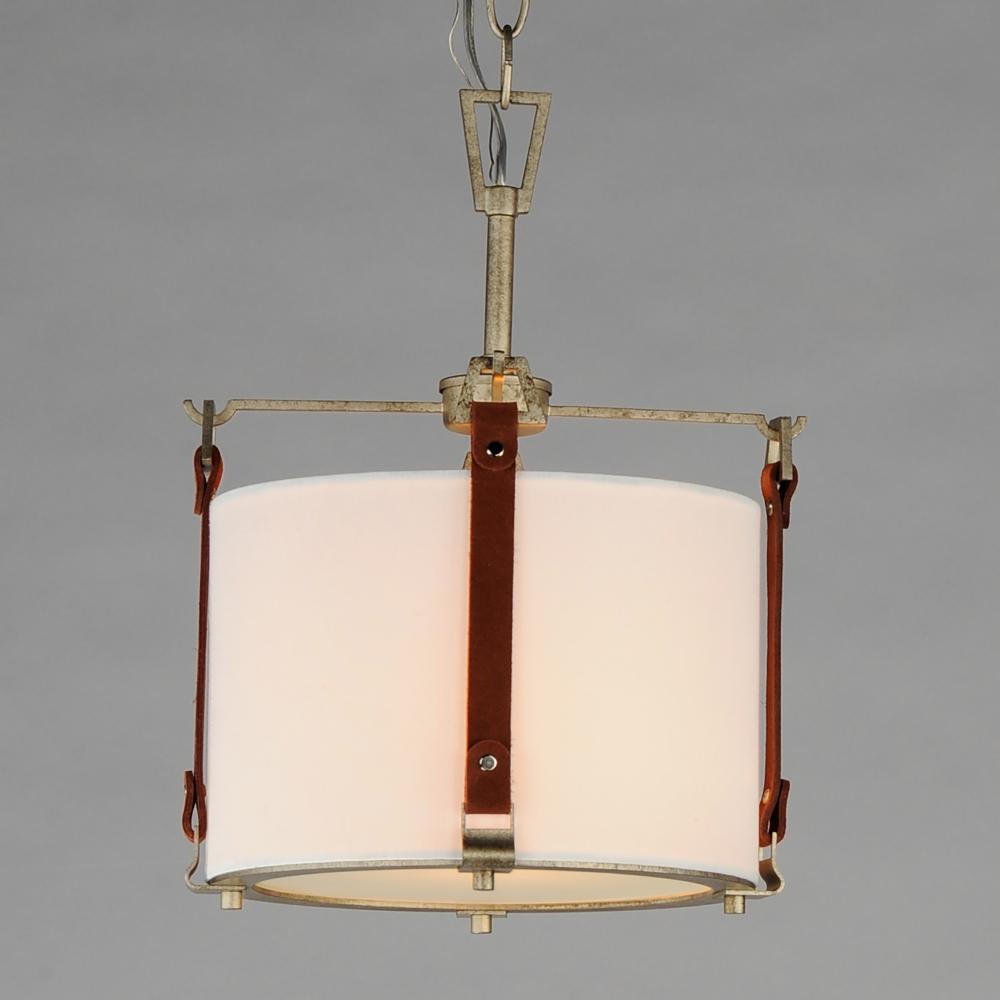 Inspired by the artist enclave north of San Francisco, pastoral elements influence this series of drum shades. Stirrup-like hooks support genuine suede straps in a Tobacco Brown finish which in turn suspend drum shades in an Off-white linen fabric. Metalwo
