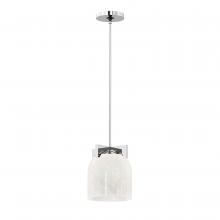 Cut-out metalwork curves around modern bell-shaped glass shades. The series includes pendants and bath vanities available in either Clear or a swirling Marble glass. Available in various complementary finishes: Polished Chrome, Matte Black, or Natural Aged