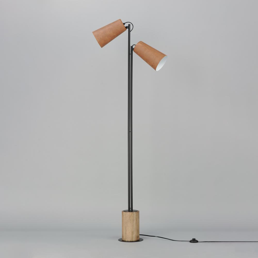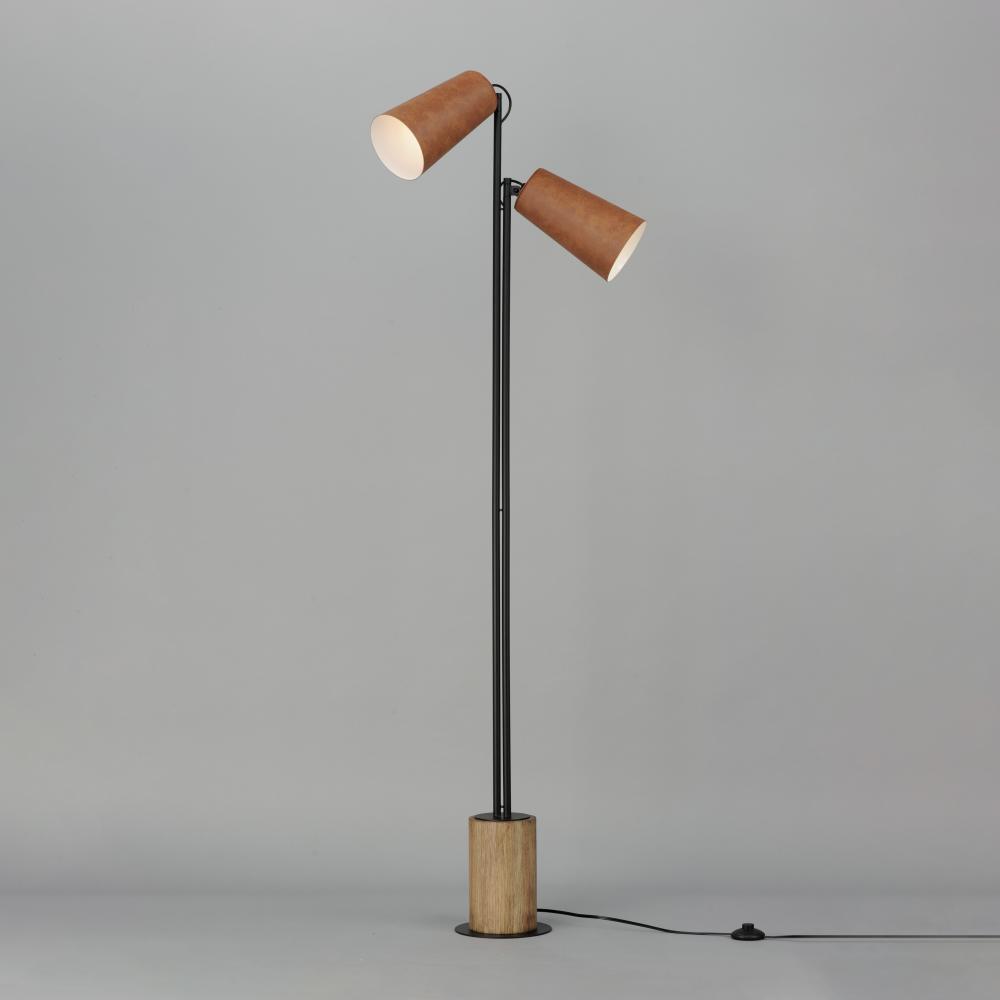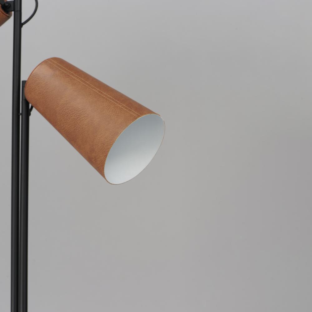 Rugged Brown leather shades are stitched and snugly fit over softly angled conical forms to create a rustic and warm lighting resource. Sturdy bases of cylindrical Distressed Wood adds a natural element with countryside appeal. Adjustable joints on the por