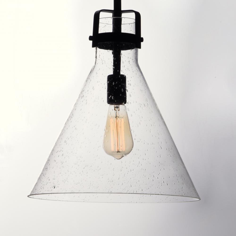 This nautical-inspired collection features Clear Seedy glass cones suspended by a yoke frame. The clear glass offers abundant lighting and compliments the styling of the fixture. Make it a more industrial look by adding filament E26 light bulbs.