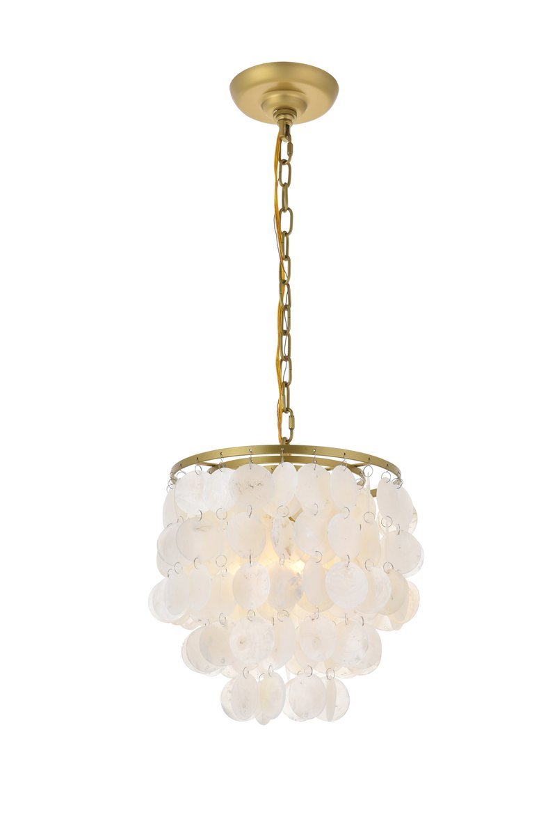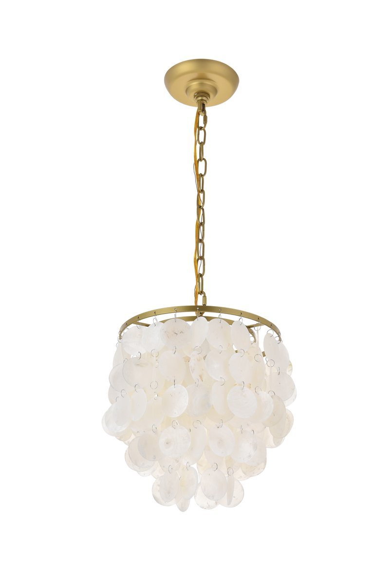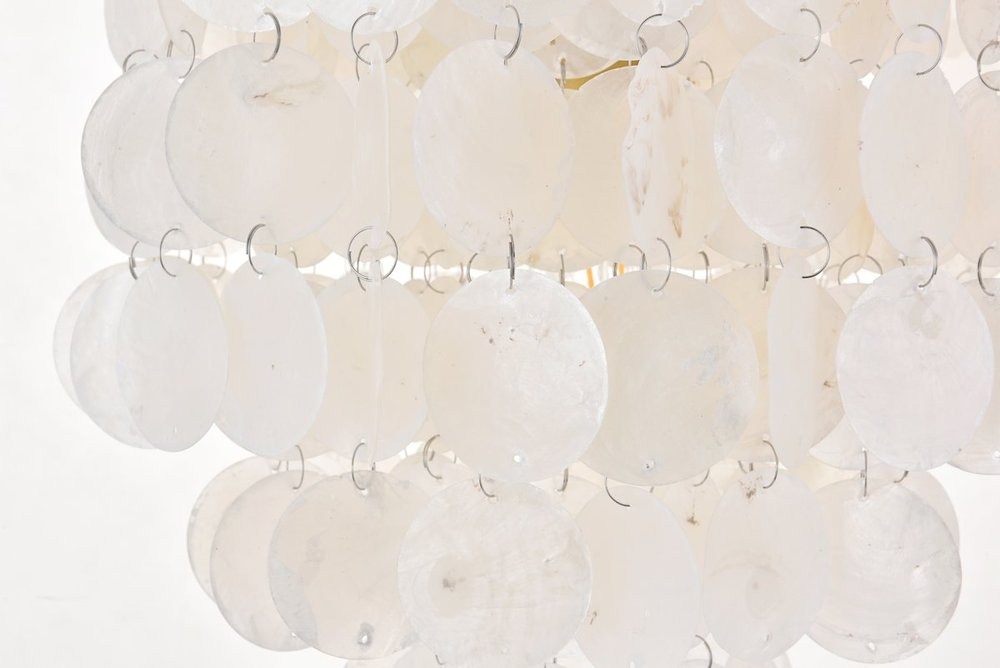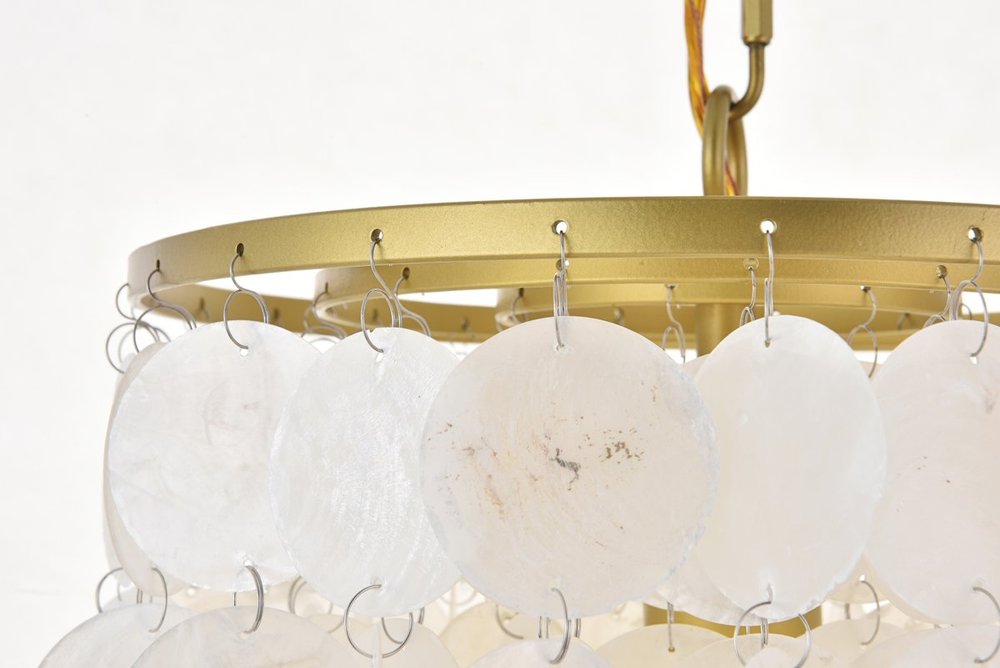 Brass finish pendant with dreamy off-white shells adorning the tiers