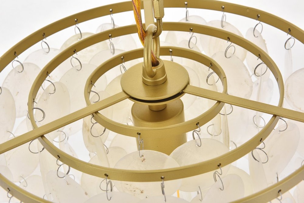 The gentleness of the Selene collection pendant lamp in a brass finish elicits the calm temperament of the moon and the coy-- yet soothing, light it emits. Weaving through the myriad of the draped shell curtains, the illumination creates a new design every time, whether it is the shadows and highlights that changes with the direction of the light, just as the moon goes through its phases, or the shadows casted with every slight movement of the white shells. A wonderful addition to any home--foyer, living room, or a child's room.