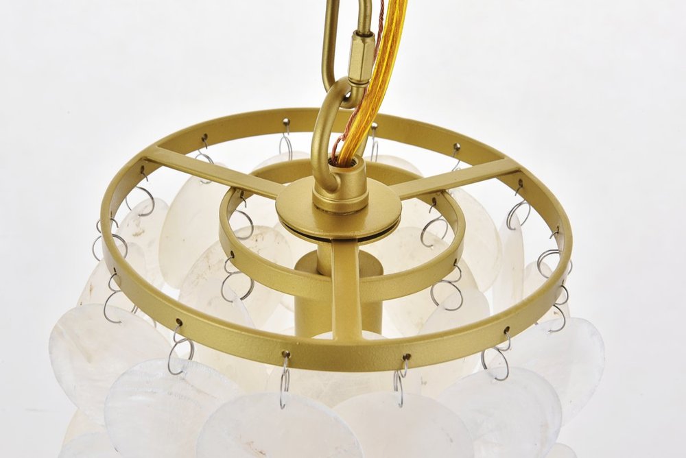 Brass finish pendant with dreamy off-white shells adorning the tiers