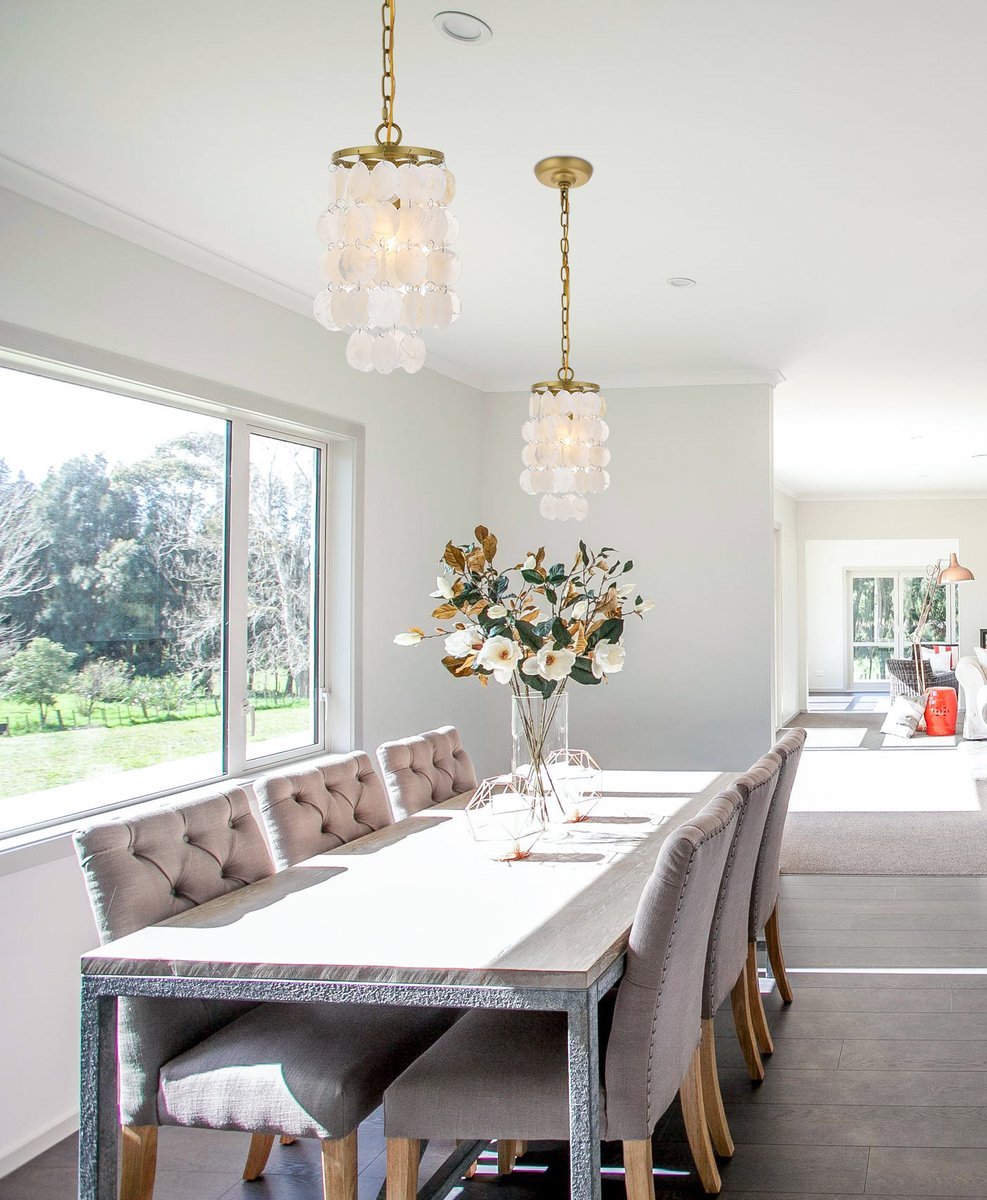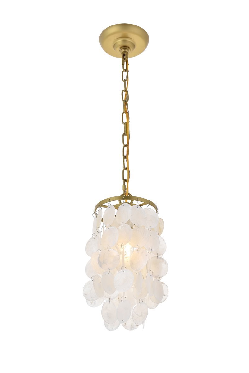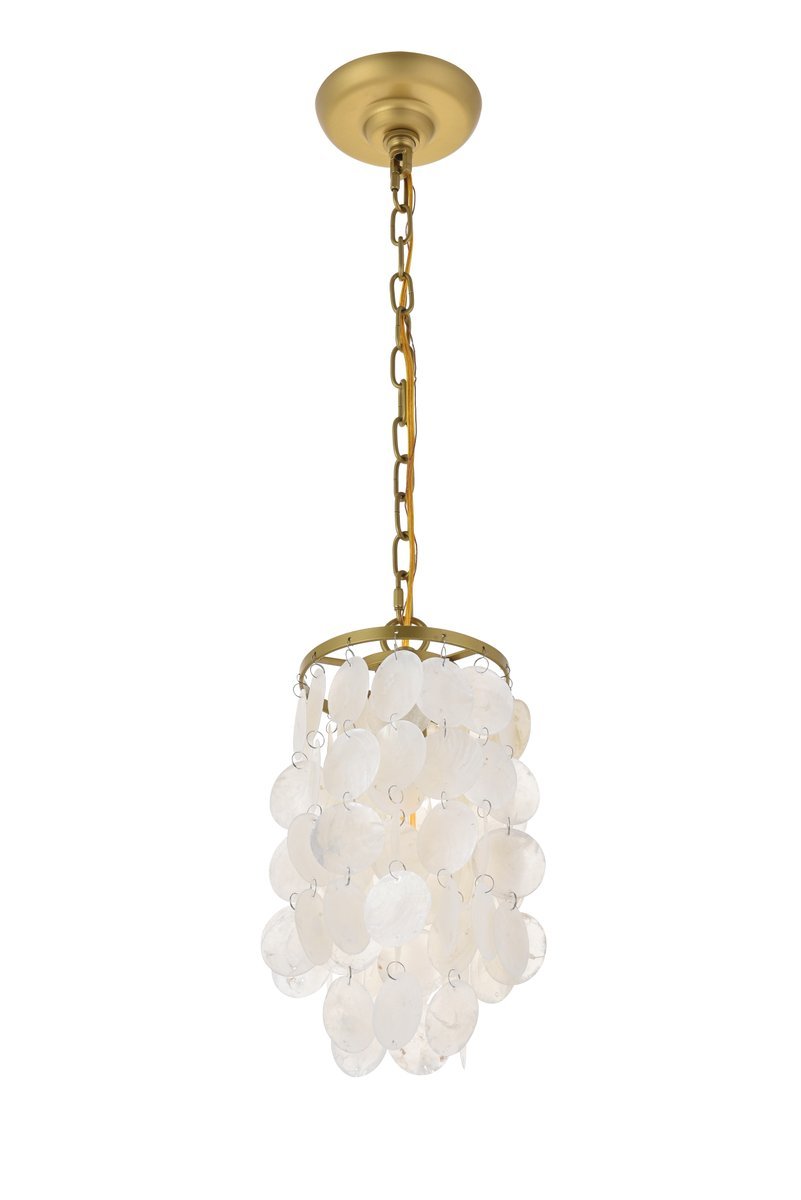 The gentleness of the Selene collection pendant lamp in a brass finish elicits the calm temperament of the moon and the coy-- yet soothing, light it emits. Weaving through the myriad of the draped shell curtains, the illumination creates a new design every time, whether it is the shadows and highlights that changes with the direction of the light, just as the moon goes through its phases, or the shadows casted with every slight movement of the white shells. A wonderful addition to any home--foyer, living room, or a child's room.