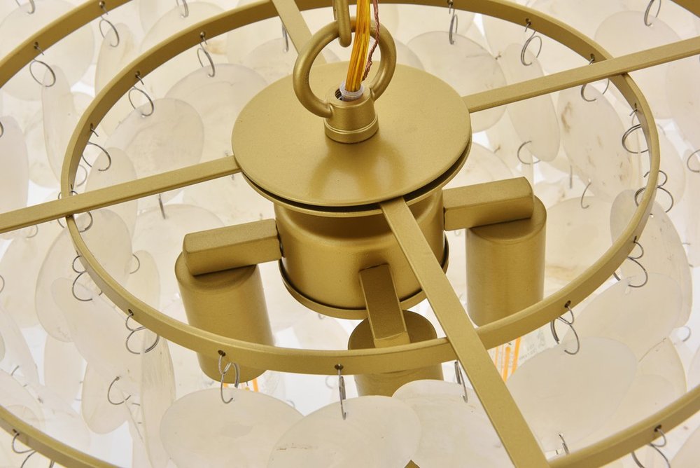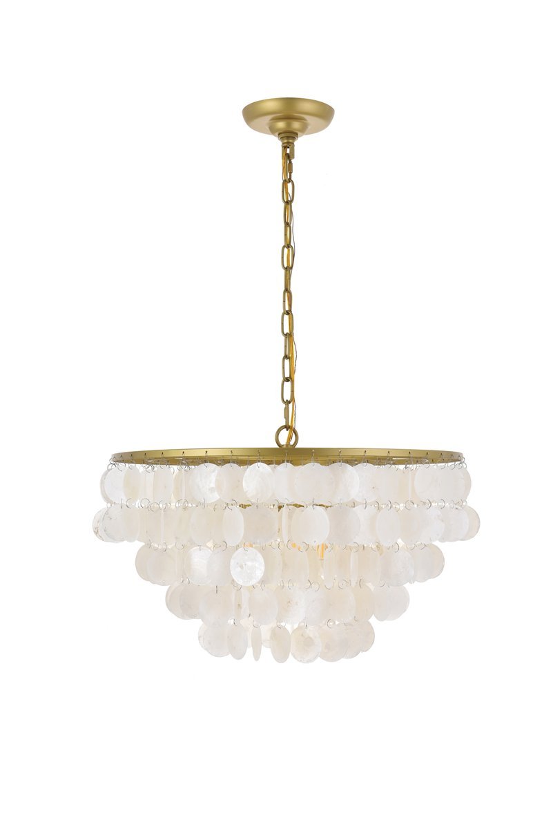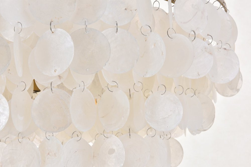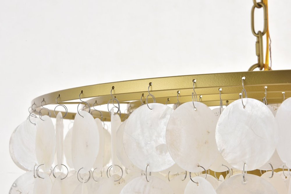 Brass finish pendant with dreamy off-white shells adorning the tiers