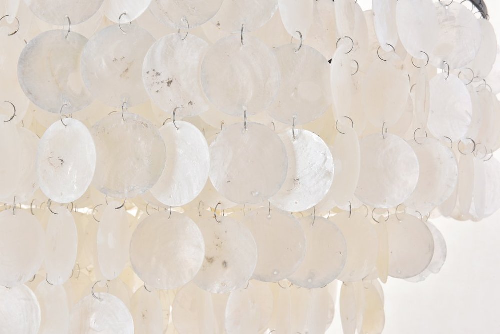 Circular off-white shells falls down in tiers, veiling the lights within
