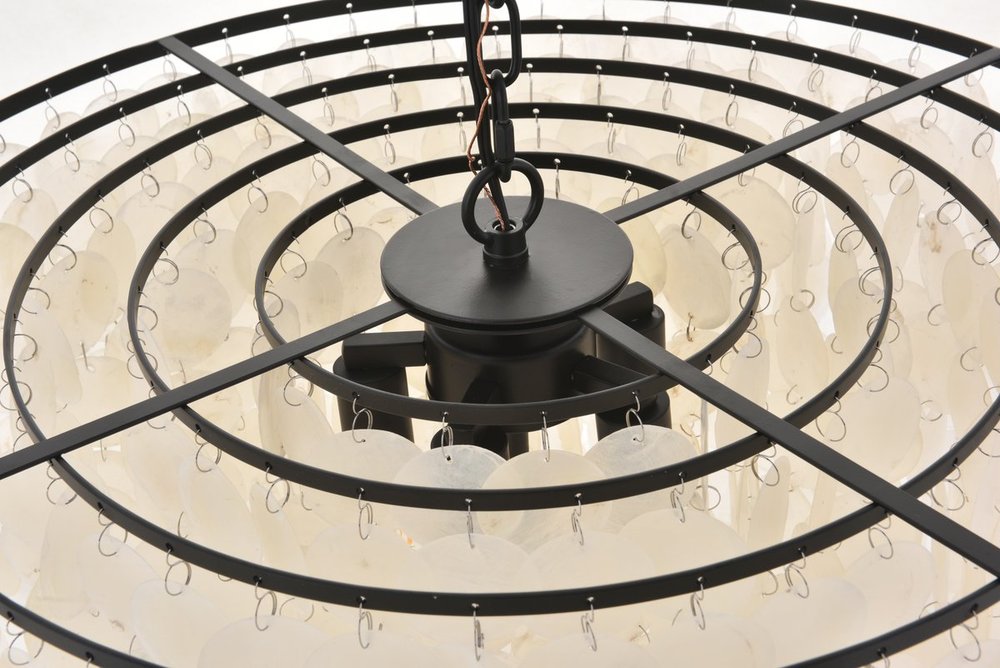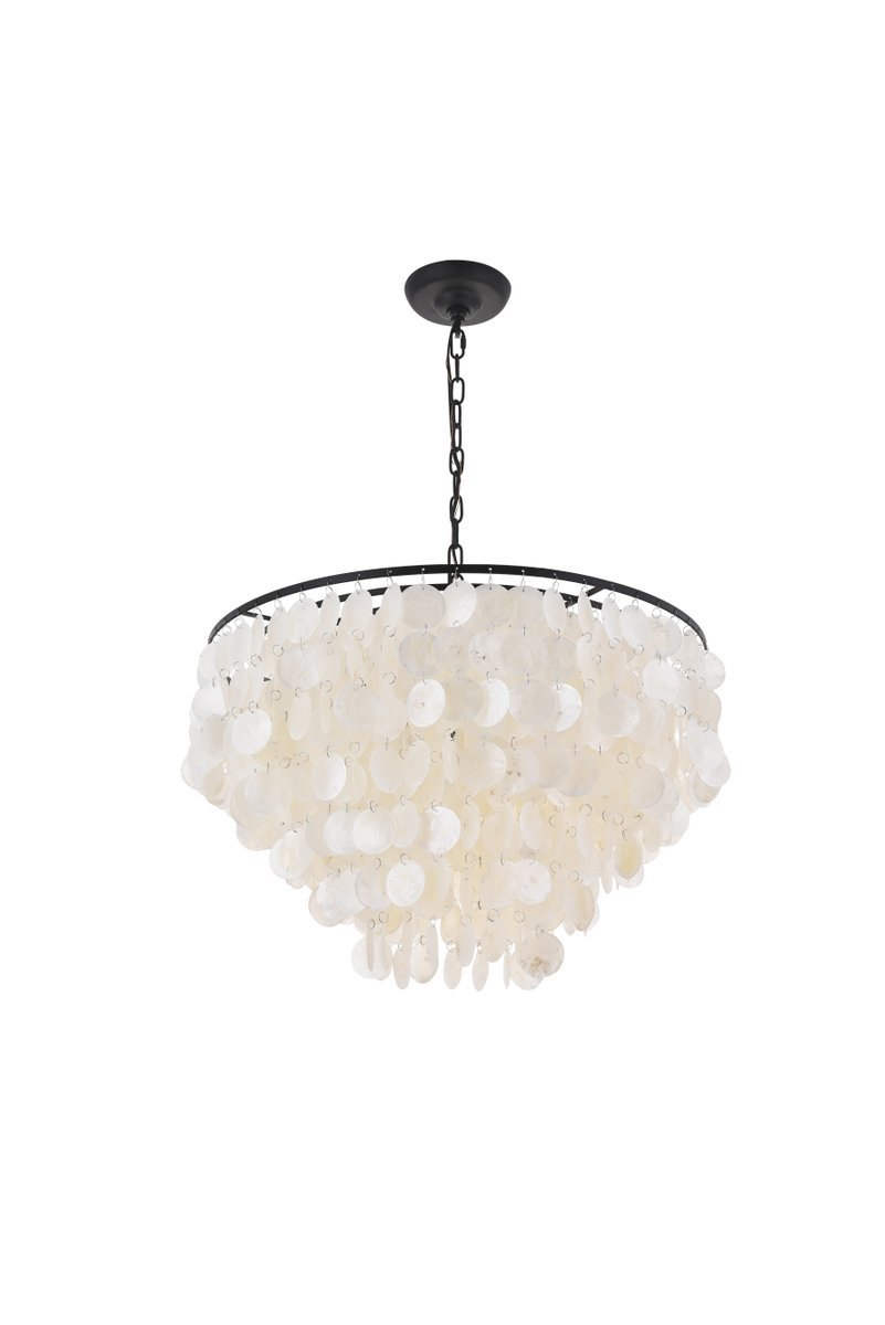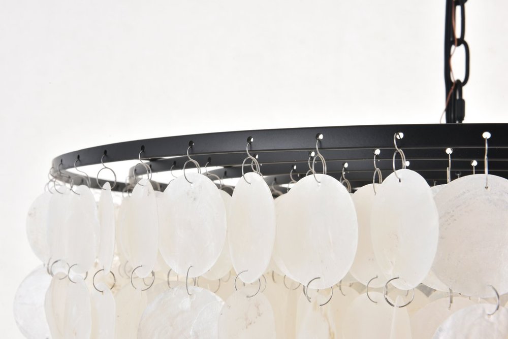 Black finish pendant with dreamy off-white shells adorning the tiers