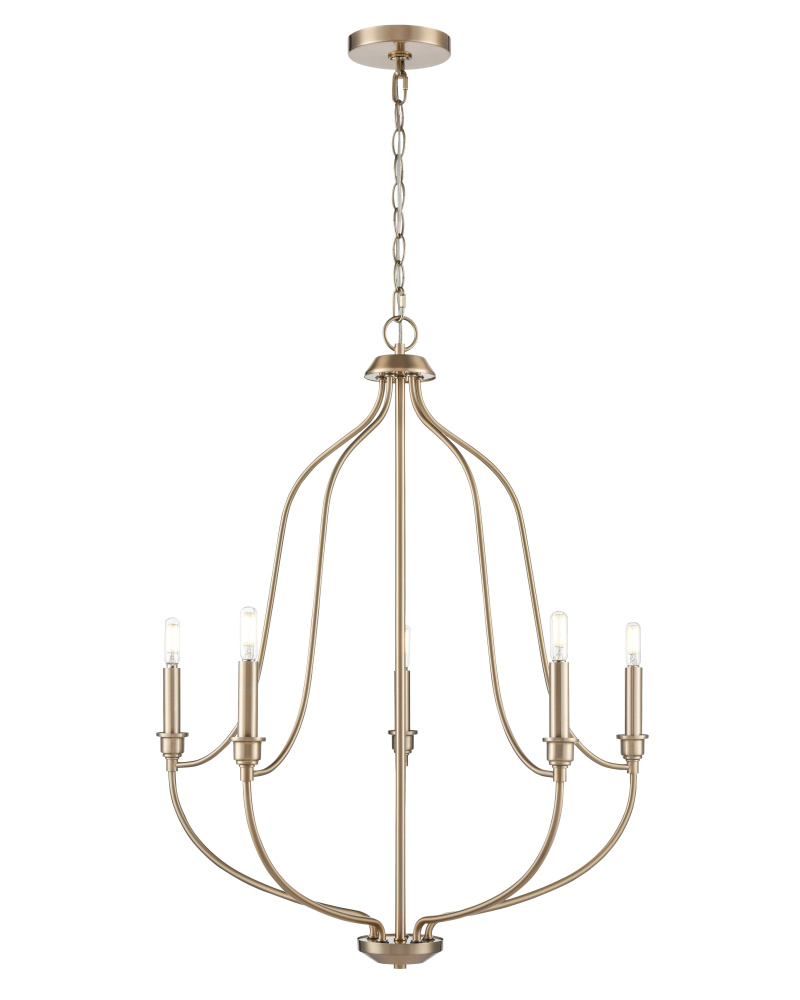 The Senoia Collection of chandeliers is a delightful interpretation of wrought iron inspired French country lighting design. Accentuated with draping lines evocative of delicate scrollwork and perfectly placed candles with cups, the collection is finished in matte black or modern gold and is available as 5-light or 9-light options. The result is a light, airy profile perfect for any interior. from modern transition to classic farmhouse.