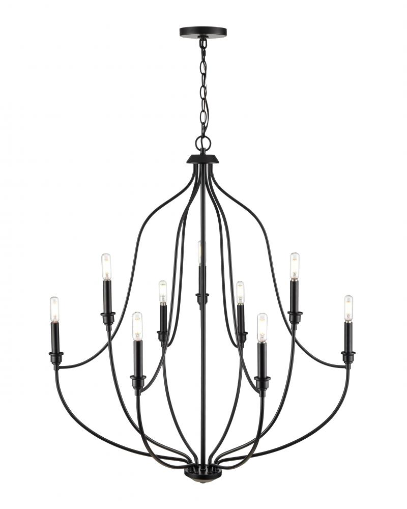 The Senoia Collection of chandeliers is a delightful interpretation of French country and bohemian lighting design. Accentuated with draping lines evocative of delicate scrollwork and perfectly placed candles with cups, the collection is finished in matte black with 5-light and 9-light options. The result is a light, airy profile perfect for a modern transition to a fully infused farmhouse.