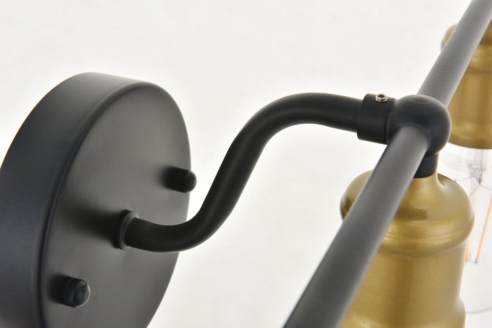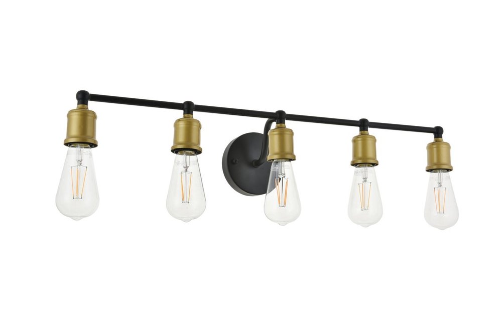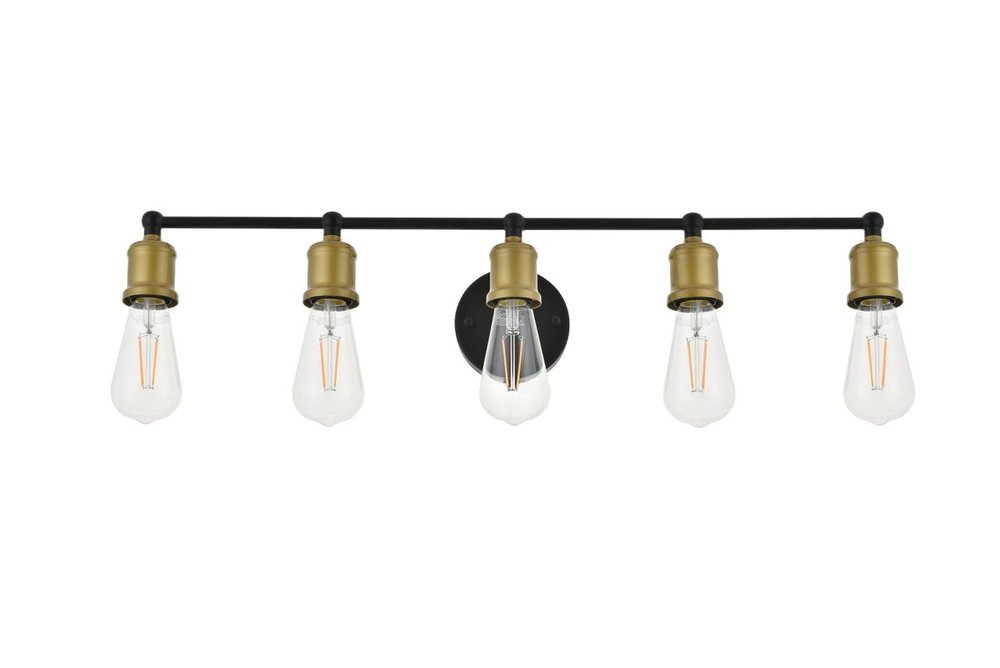 The classical elegance of the Serif collection wall lamp in a brass and black finish brings graceful allure. The arms--reminiscent of a classical font-- supports the 5 lights that emit a reassuring brilliance, and its gentle presence makes it a wonderful fixture to greet your guests at the entry way, illuminate your cabinets in the living room, or shine in the powder room.