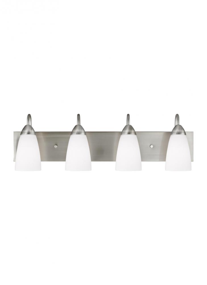 The Seville four light vanity fixture in brushed nickel provides abundant light for your bath vanity, while adding a layer of today's style to your interior design. The Seville collection represents commitment to high style at a sharp price. The modernist design is epitomized by the teardrop curves in the arms tipped by Etched glass diffusors throughout the chandeliers and bath fixtures. The collection offers a whole home lighting solution in every imaginable category. The assortment includes nine-light, five-light, and three-light chandeliers (either with up-light or down-light), pendants in four sizes as well as one-light, two-light, three-light , four-light and five-light wall/bath fixtures. Install a stylish and elegant addition to any room in the house. Seville is offered in Brushed Nickel and Burnt Sienna finishes.