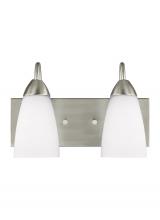 The Seville two light vanity fixture in chrome offers shadow-free lighting in your powder room, spa, or master bath room. The Seville collection represents commitment to high style at a sharp price. The modernist design is epitomized by the teardrop curves in the arms tipped by Etched glass diffusors throughout the chandeliers and bath fixtures. The collection offers a whole home lighting solution in every imaginable category. The assortment includes nine-light, five-light, and three-light chandeliers (either with up-light or down-light), pendants in four sizes as well as one-light, two-light, three-light , four-light and five-light wall/bath fixtures. Install a stylish and elegant addition to any room in the house. Seville is offered in Brushed Nickel and Burnt Sienna finishes.