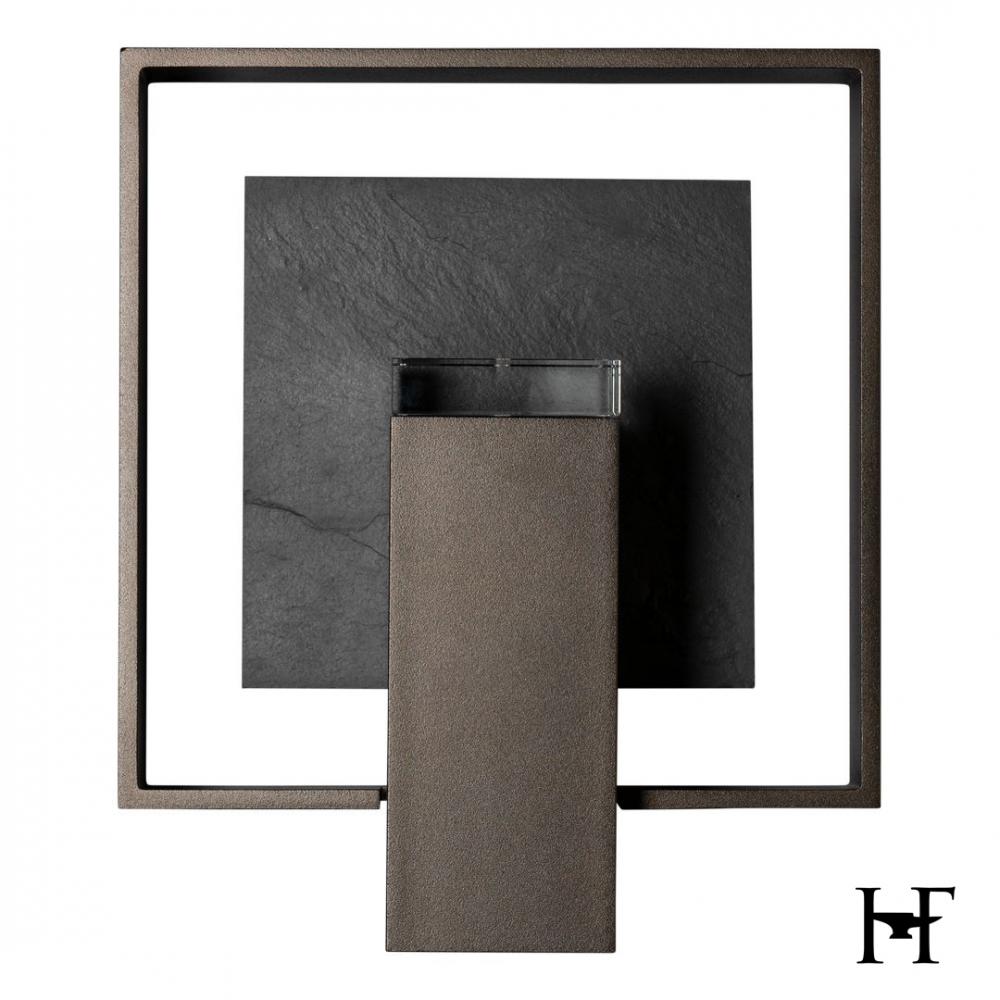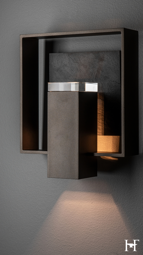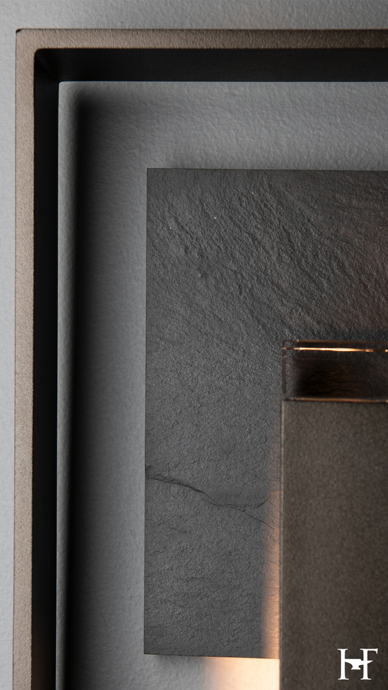 Inspired by contemporary architecture, Designer David Martin combines minimalism and elegance.This exterior fixture has a Vermont black slate backdrop within a square aluminum frame and is offered with any of our robust AAMA 2604-rated Coastal Outdoor Finishes. A light inhibitor, featured on this Dark Sky Friendly version, helps to protect our skies from unnecessary light pollution.