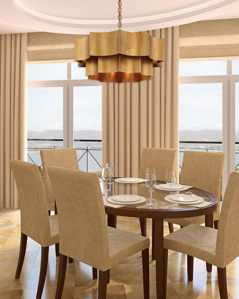 Doubling the wow factor of the original 3-light Shelby pendant, this 6-light version from Savoy House features two stacked bands of delicately crimped gold patina finished metal hanging from a single gold chain. Alluring, upscale and completely unique, this simple yet striking contemporary light fixture is appropriate for almost any spot in the home. It’s a break from tradition in kitchens and dining rooms, and a welcome surprise as bedroom, entry or bath lighting. Compatible with transitional, contemporary and mid-century modern interiors, the Shelby pendant light is also perfect for pairing with contrasting metals like silver cabinet hardware and photo frames to easily achieve today’s popular mixed metal decorating trend.